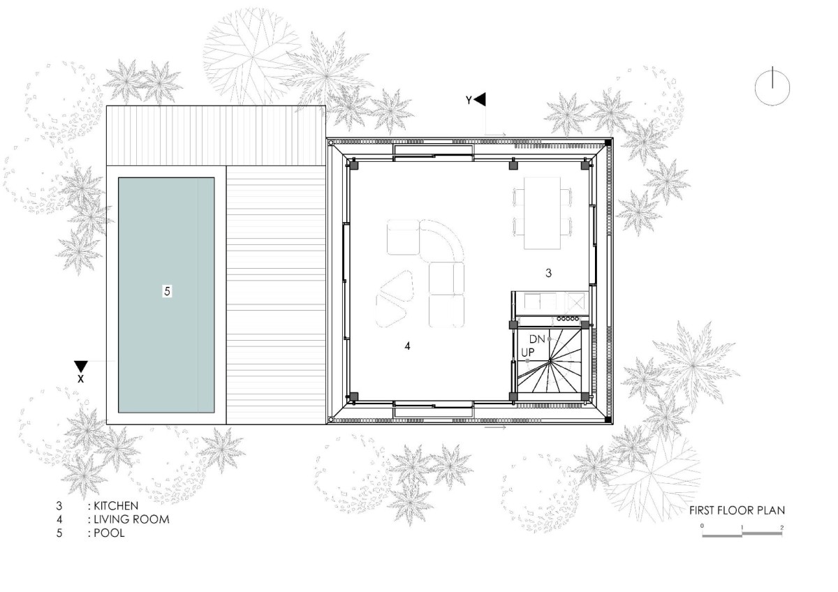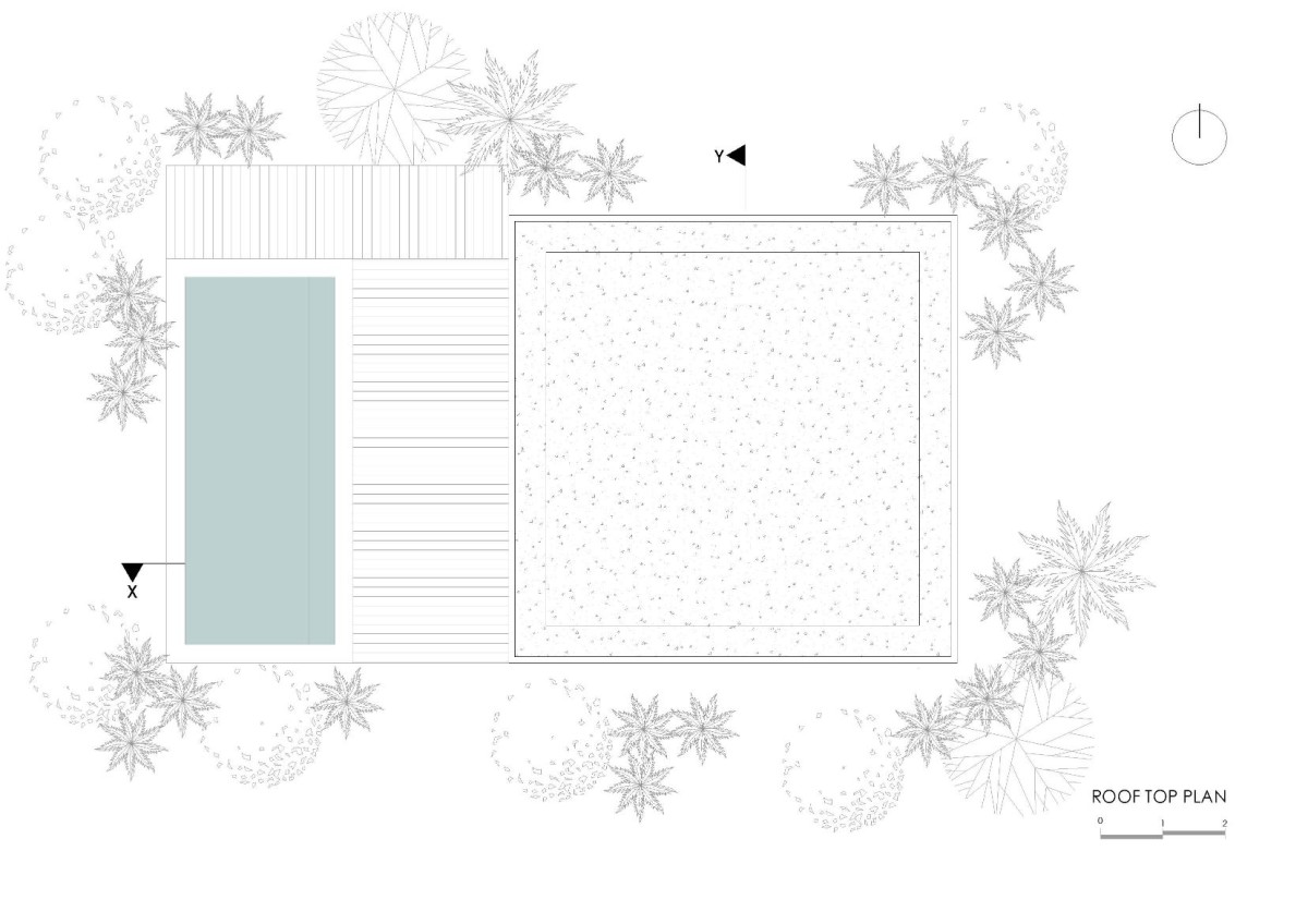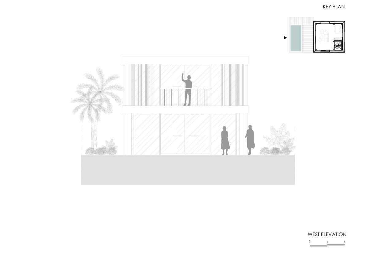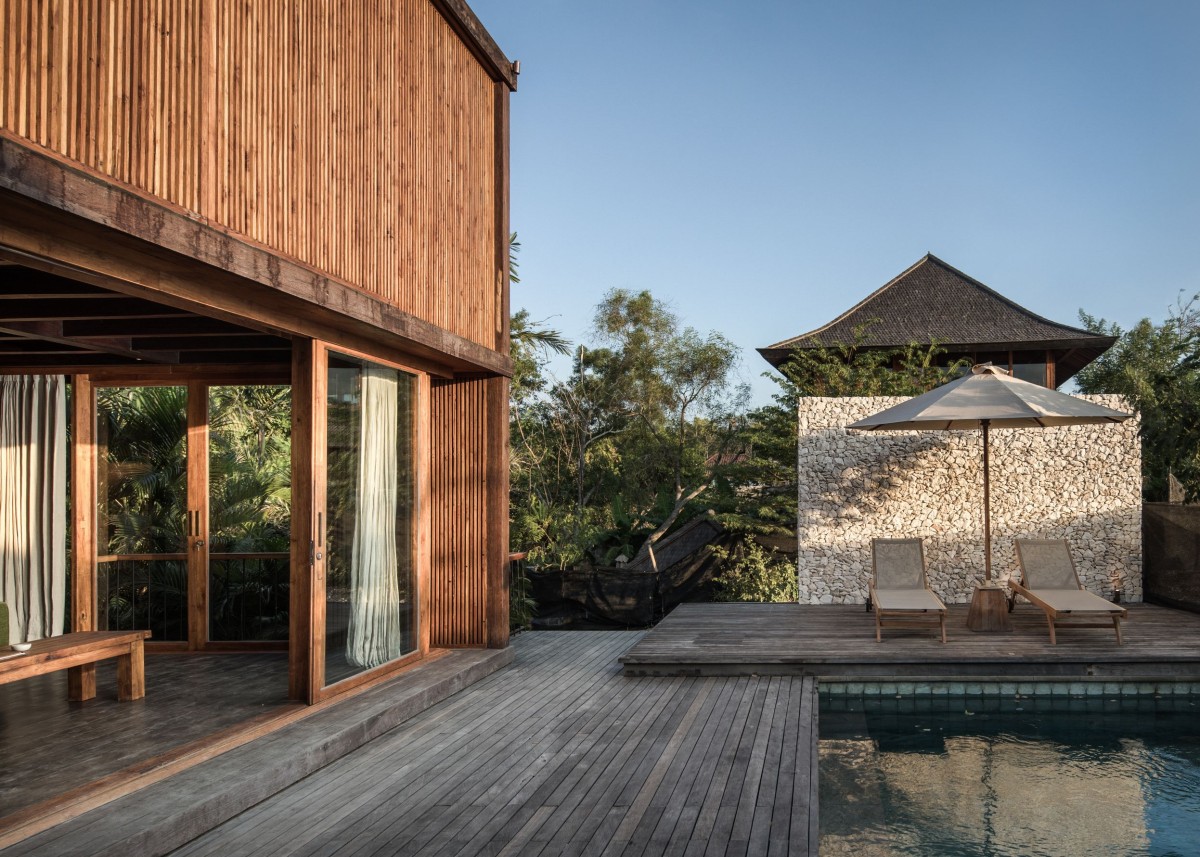 The structure is made of carefully selected reused teak and ironwood, glass, steel elements and local limestone. The façade consists of movable vertically slatted screens that filter and soften the piercing tropical sunlight, enabling the external shading of the large glass elements that can be opened on all four sides of the building, which changes the buildings appearance. The rooms house a small collection of vintage black & white photography by Dick Hoole, legendary surf photographer.