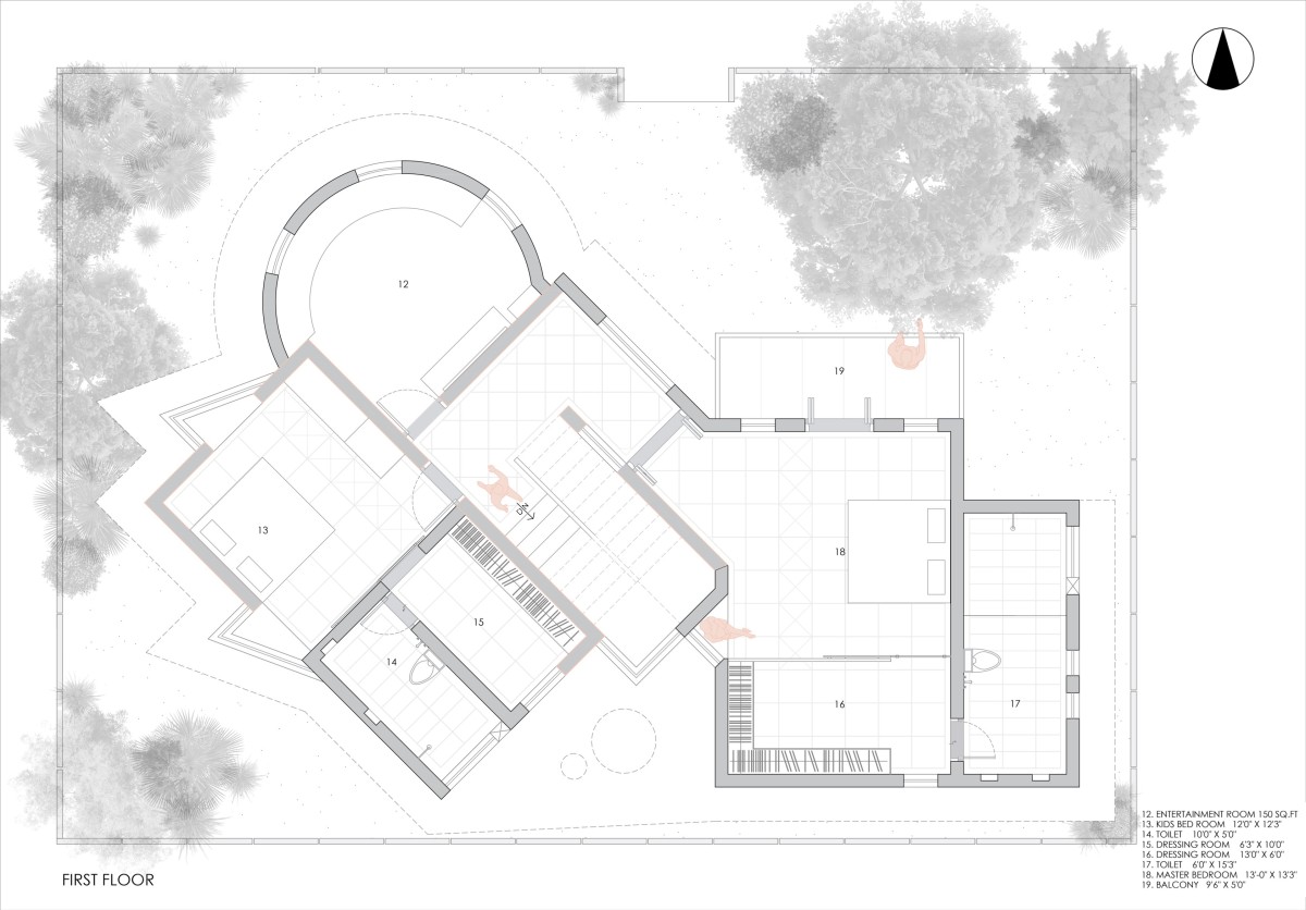 The first floor features a circular family entertainment room with an oxidized floor finish, adding a distinct visual texture to the space. Generous openings allow natural light and ventilation, enhancing the room’s ambiance.