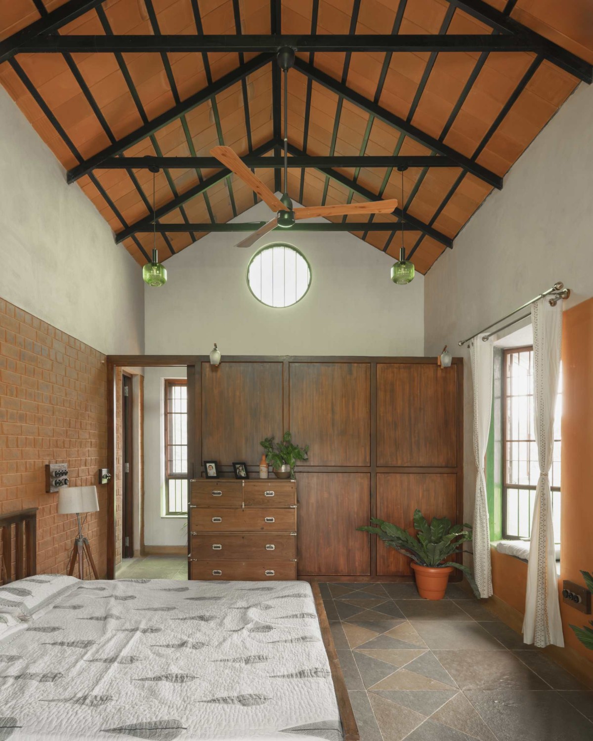 Children’s bedrooms are curated in a way that engages with varied roof volumes a vaulted ceiling, and an angular cross-ventilated louvered window that penetrates diffused light into the room, creating a dynamic interplay of light and shadow.