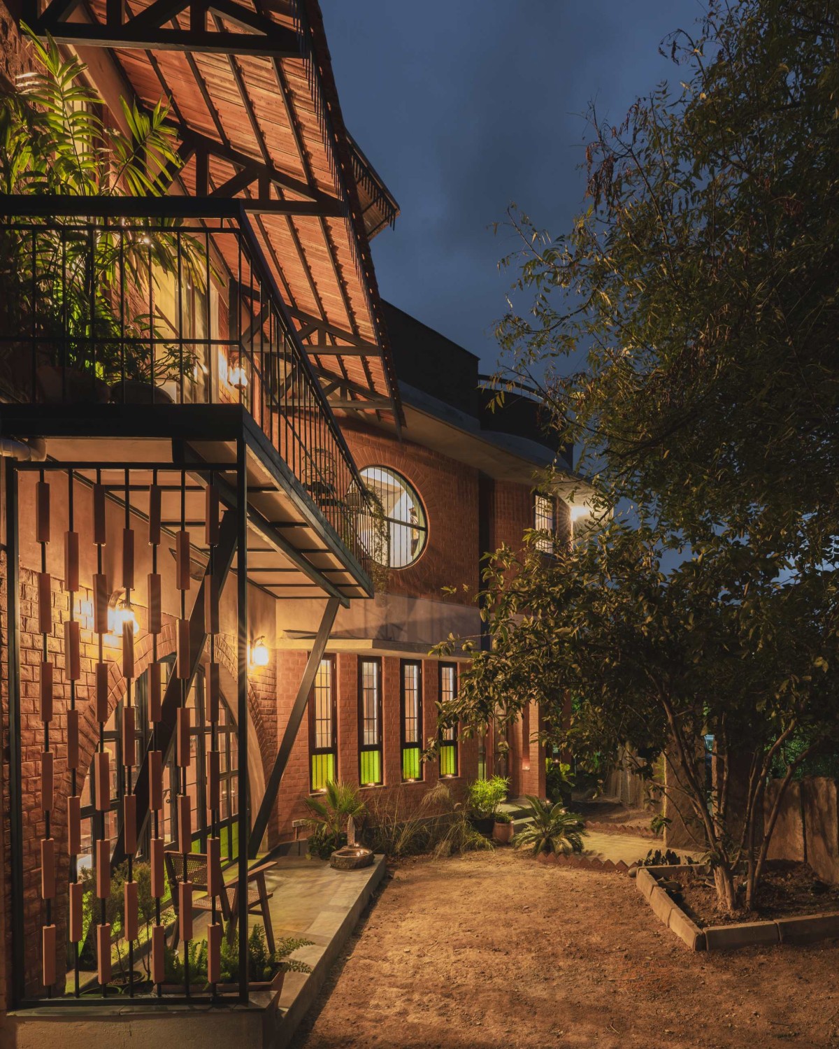 Night exterior view of Onella by Bhutha Earthen Architecture Studio