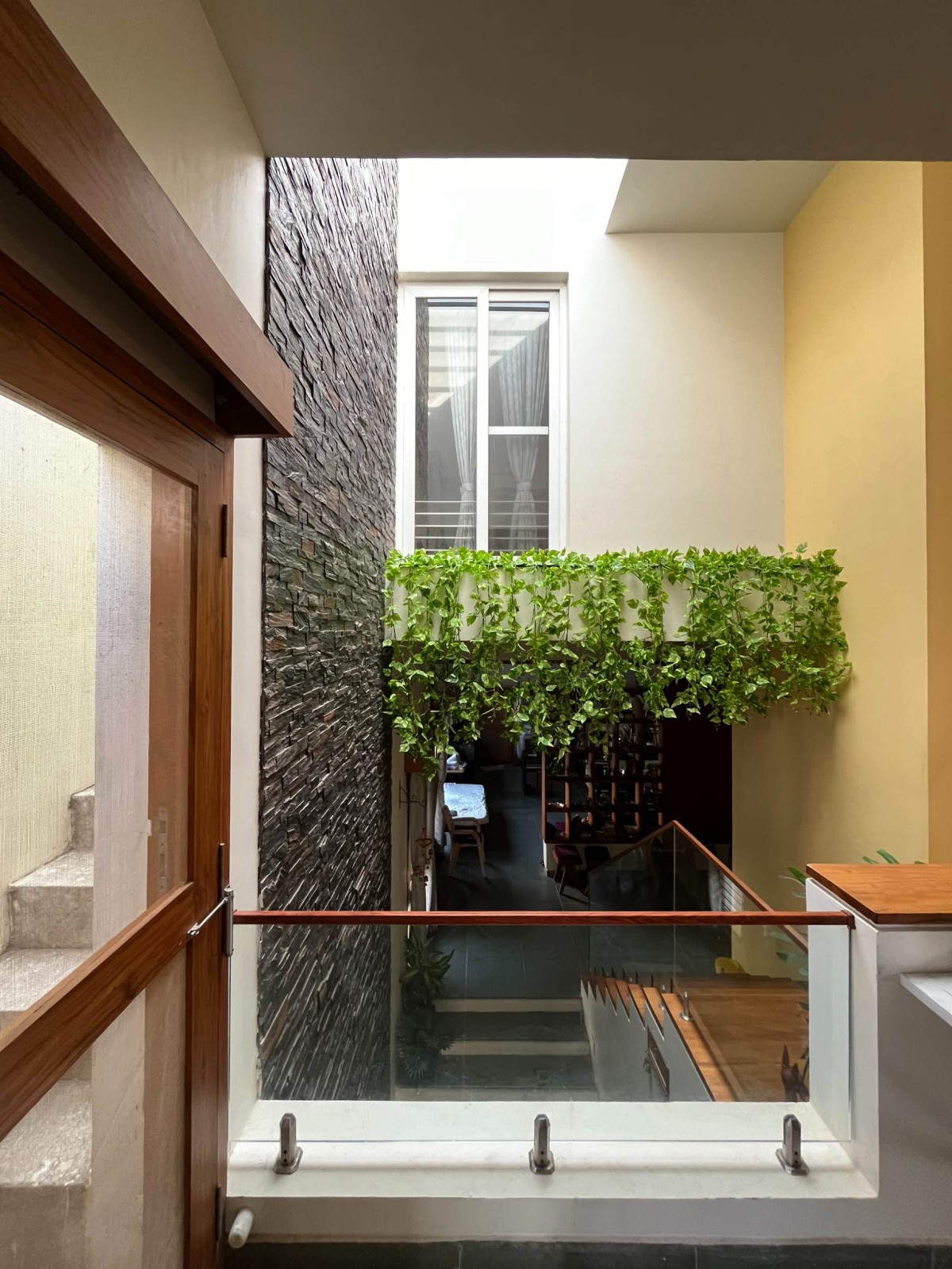 Material decisions reinforce this conceptual clarity. A restrained palette emphasizes thermal performance and tactile comfort. Kota stone flooring moderates interior temperature, while exposed surfaces allow light to articulate depth and proportion. Natural stone cladding is introduced along the core of the double-height skylight, grounding the vertical volume and providing visual weight that anchors its scale. This material articulation prevents the central void from reading as a narrow shaft, instead establishing it as a defined spatial element within the house. Cascading vegetation is integrated into the void, softening vertical scale and introducing seasonal change into the interior atmosphere.