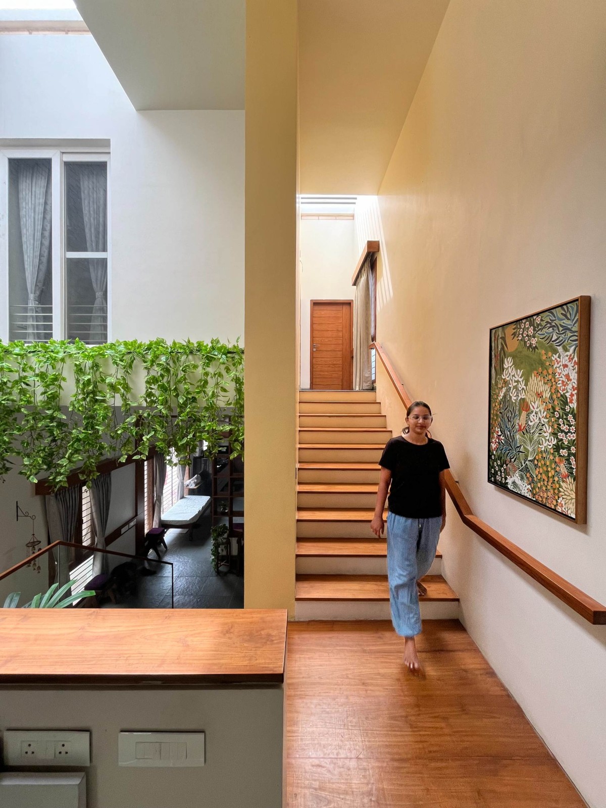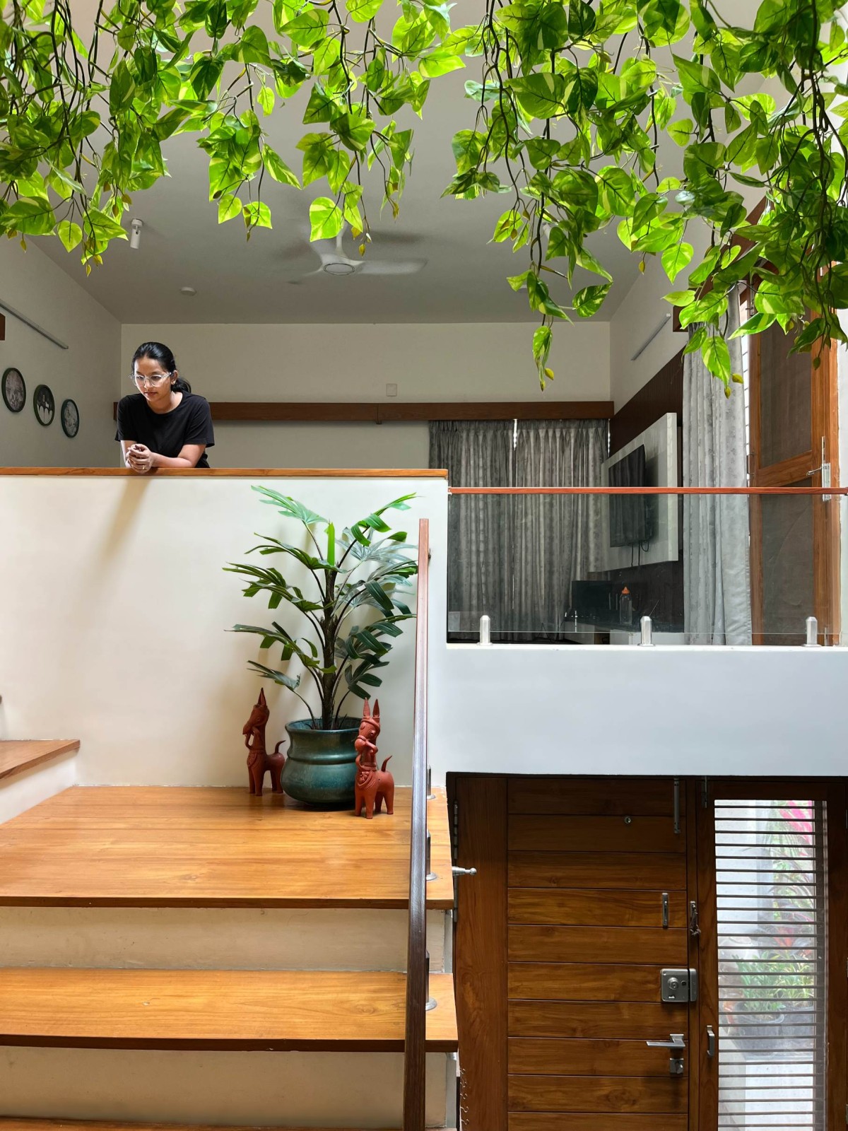 Circulation unfolds along the perimeter of this vertical volume, ensuring that movement remains engaged with the central space. Instead of corridors isolating rooms, transitions occur along edges that maintain sightlines across levels. An intermediate mezzanine is inserted within the height of the void, allowing occupation within the vertical field itself. This strategy transforms section into lived space, where inhabitation occurs in dialogue with light, air, and shared activity. The staircase to the terrace is positioned externally, accessed from the mezzanine level, to preserve the spatial clarity of the interior core.