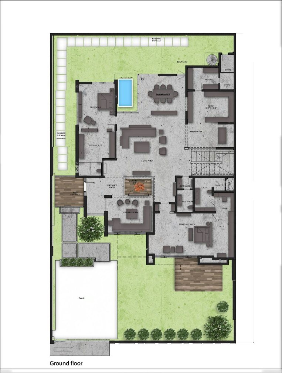 With an open view of the backyard, the dining room looks out onto the kitchen and the living area. Both the ground floor and the first floor have two bedrooms, both with attached washrooms, and each bedroom has been designed tastefully according to the needs of its occupants.