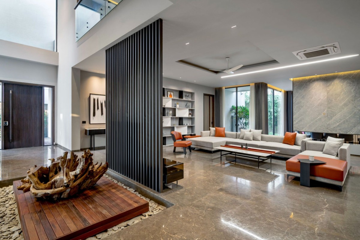 At the heart of the house is a wooden deck, right at the entrance, which helps define and divide the areas between the formal and the informal seating areas. The wooden deck adorns a piece of wooden log sourced specially from Himachal. The entire house is designed and constructed with a sense of connection with nature through transparency with windows. With the floor to ceiling windows, a sense of openness and inside out is created. The lobby is linked by glass connectors, lending elegance to the flow, while the relationship between spaces fosters a sense of intimacy.