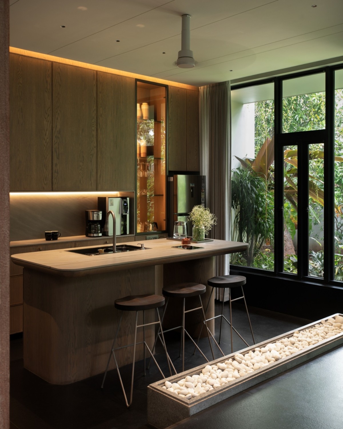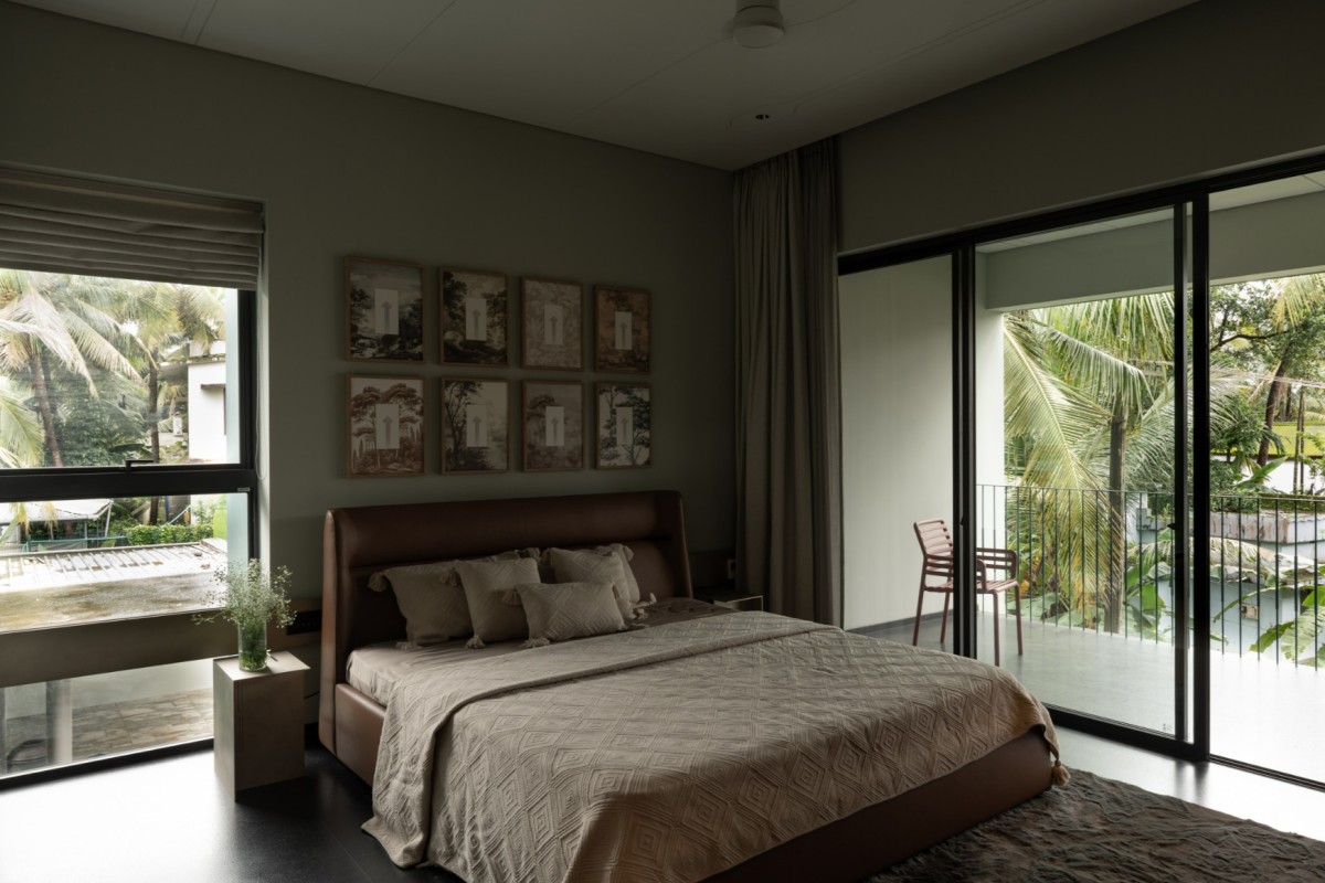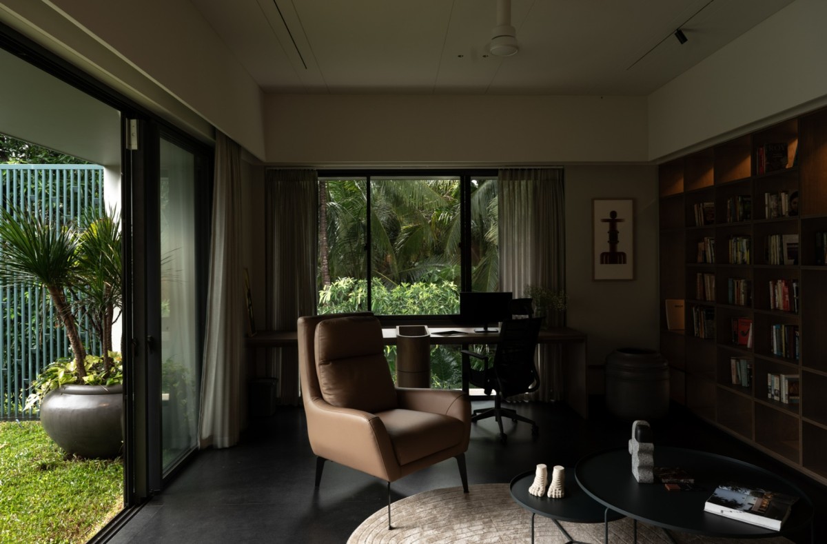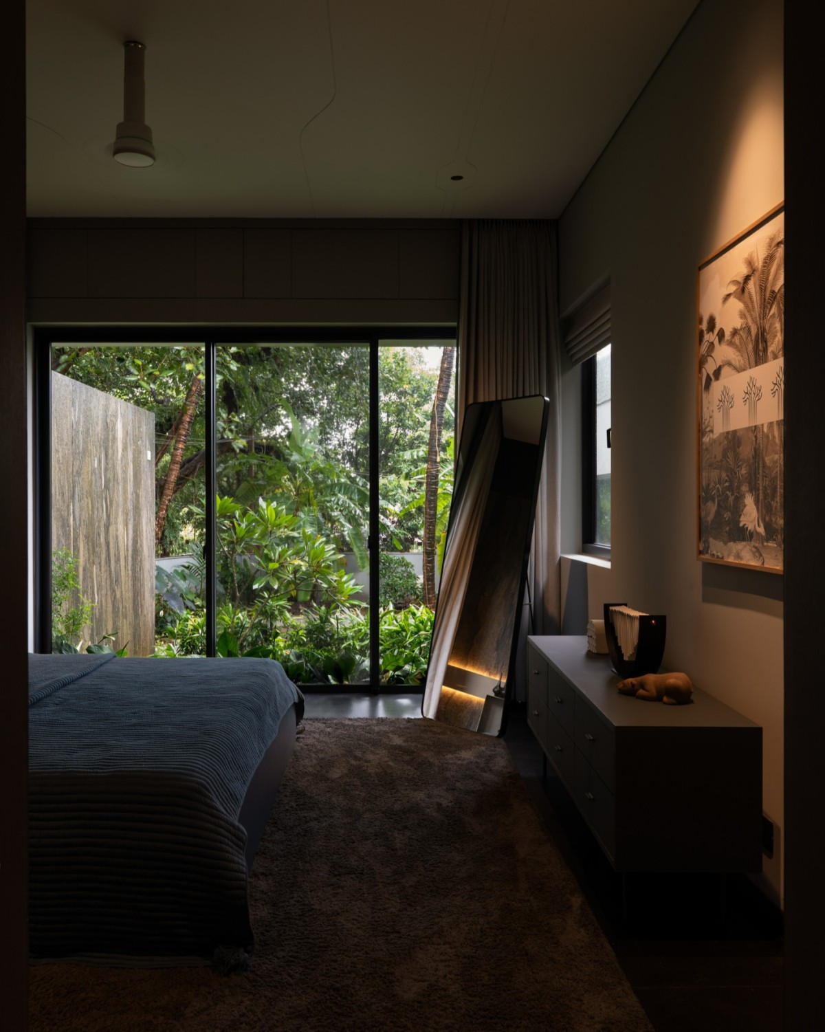 The southern block follows the site’s natural contours, allowing gentle level shifts instead of flattening the terrain. This creates spatial continuity on the upper floor, most notably in the study, which enjoys an uninterrupted view through the deck to the pool. The placement of the pool on the first floor, west side, accomplished 2 things: privacy, owing to the adjacent temple - which restricts vertical development on that edge - and freeing up the ground floor for landscaping.