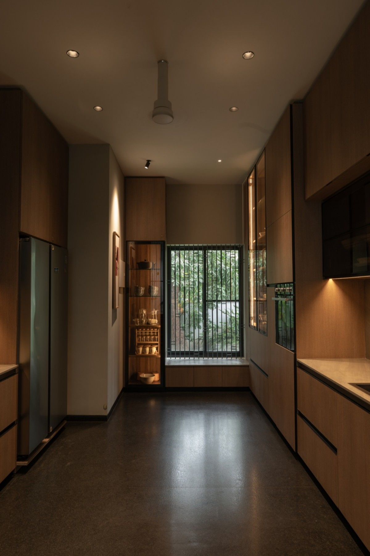 The finishes for the interiors have been carefully chosen to maintain a neutral and minimal color palette, the different shades of grey for the walls and ceilings, for instance. The only color applied is to that of the custom-made art pieces. Keeping in harmony with the muted colors, neutral oak-colored mica, veneers for kitchen cabinets and a grey counter top were chosen by the architects.