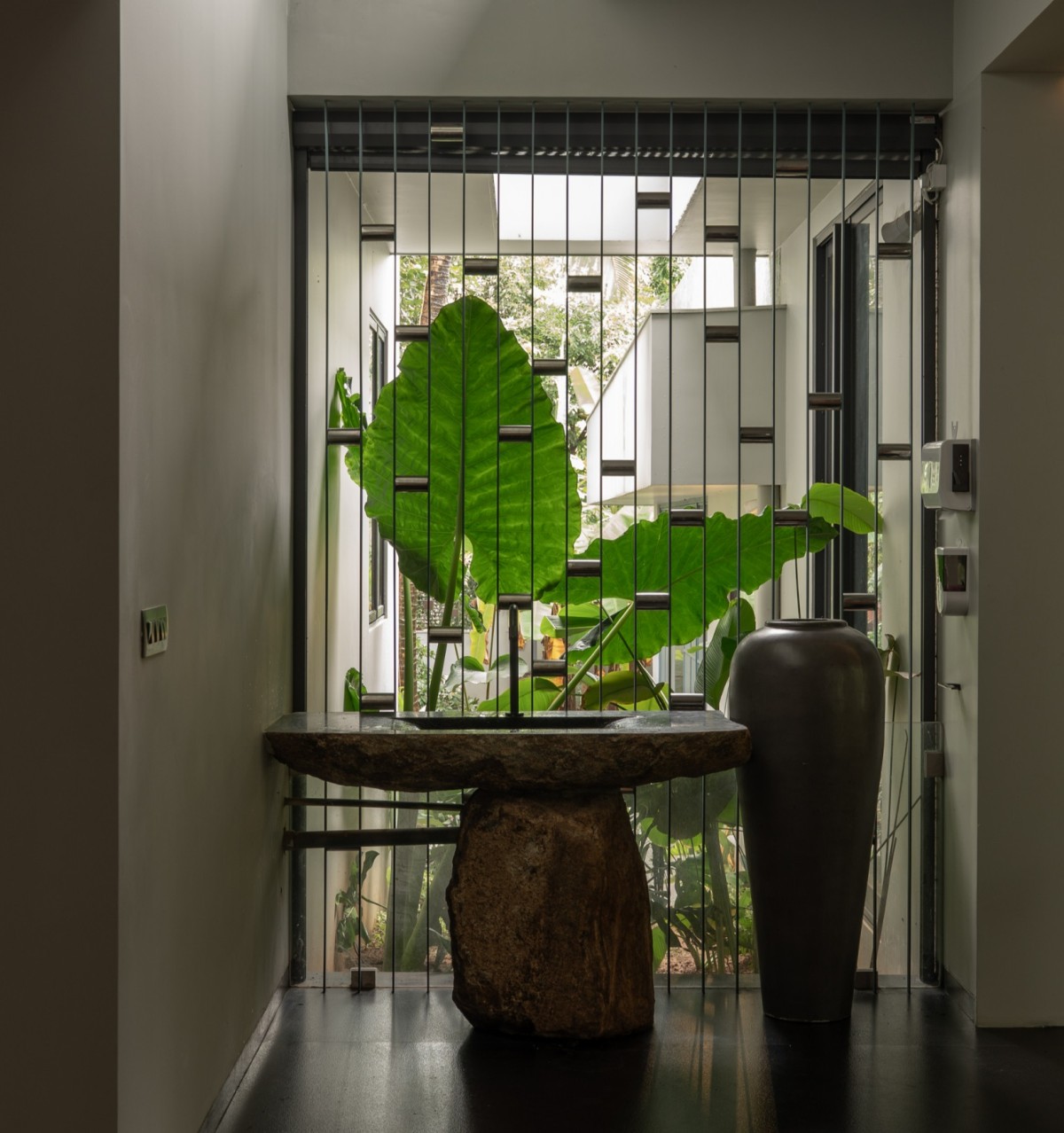 Internally, the house is separated into 2 zones. The northern block houses common areas (living, dining, kitchen) and encourages interaction, and southern block houses private areas (bedrooms, bathrooms) and ensures seclusion, separated by the buffer zone, housing the staircase and the wash area.