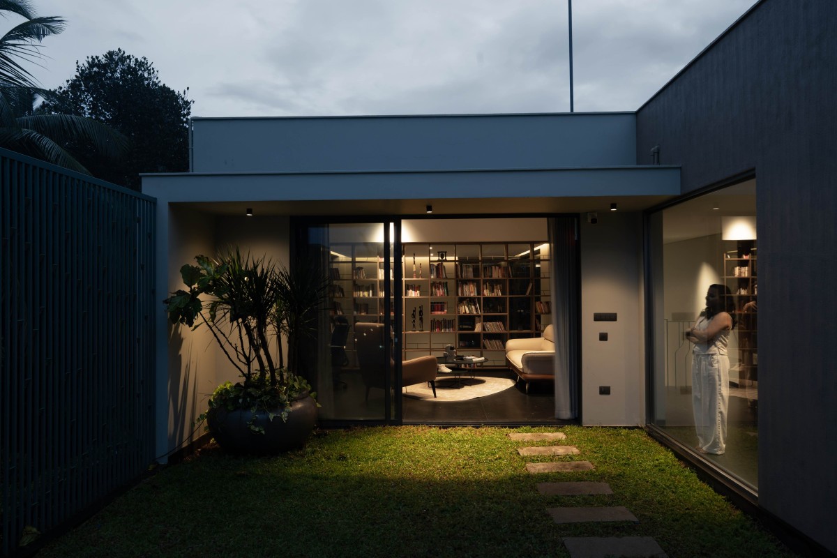 The exterior uses raked cement plaster with leather-finish black granite, whose textured undulations glow dramatically when lit. Granite, chosen for its hardness and weather resistance, appears throughout the house, reflecting the client’s deep knowledge of geology.