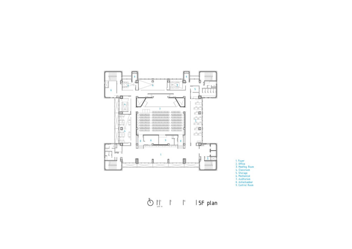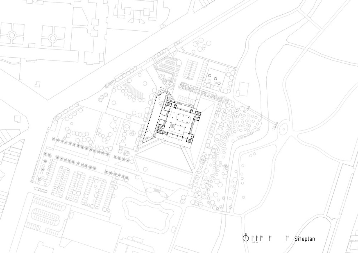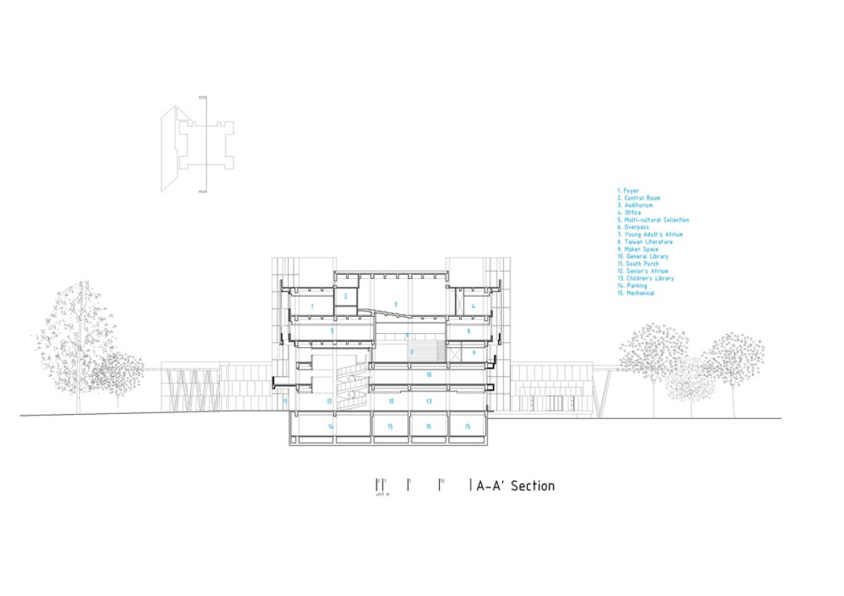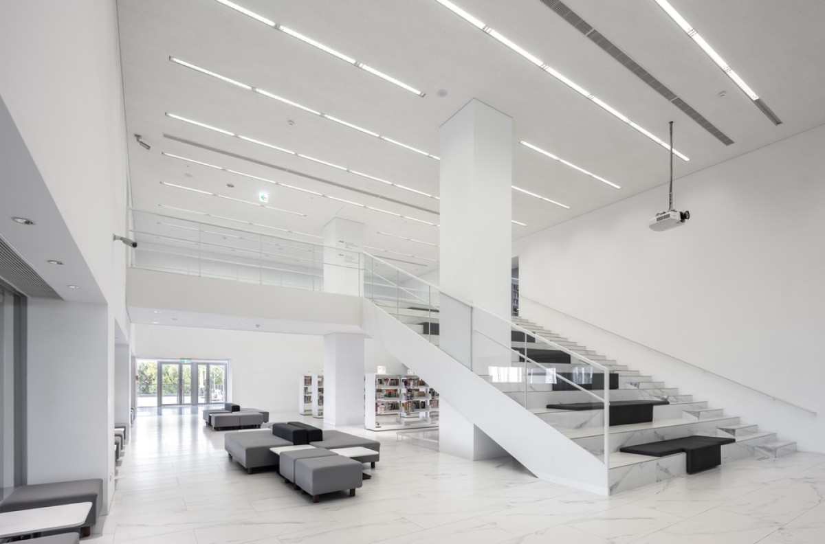 The exterior of the original structure is now clad in white aluminum panels and louvers. An arcade extends from the original entrance to function as an in-between space between the reading room and the lawn, which was transformed from the depleted entrance plaza. The new landscape design connects the library seamlessly to its surrounding park, inviting citizens to use this new public space regardless of their purpose.