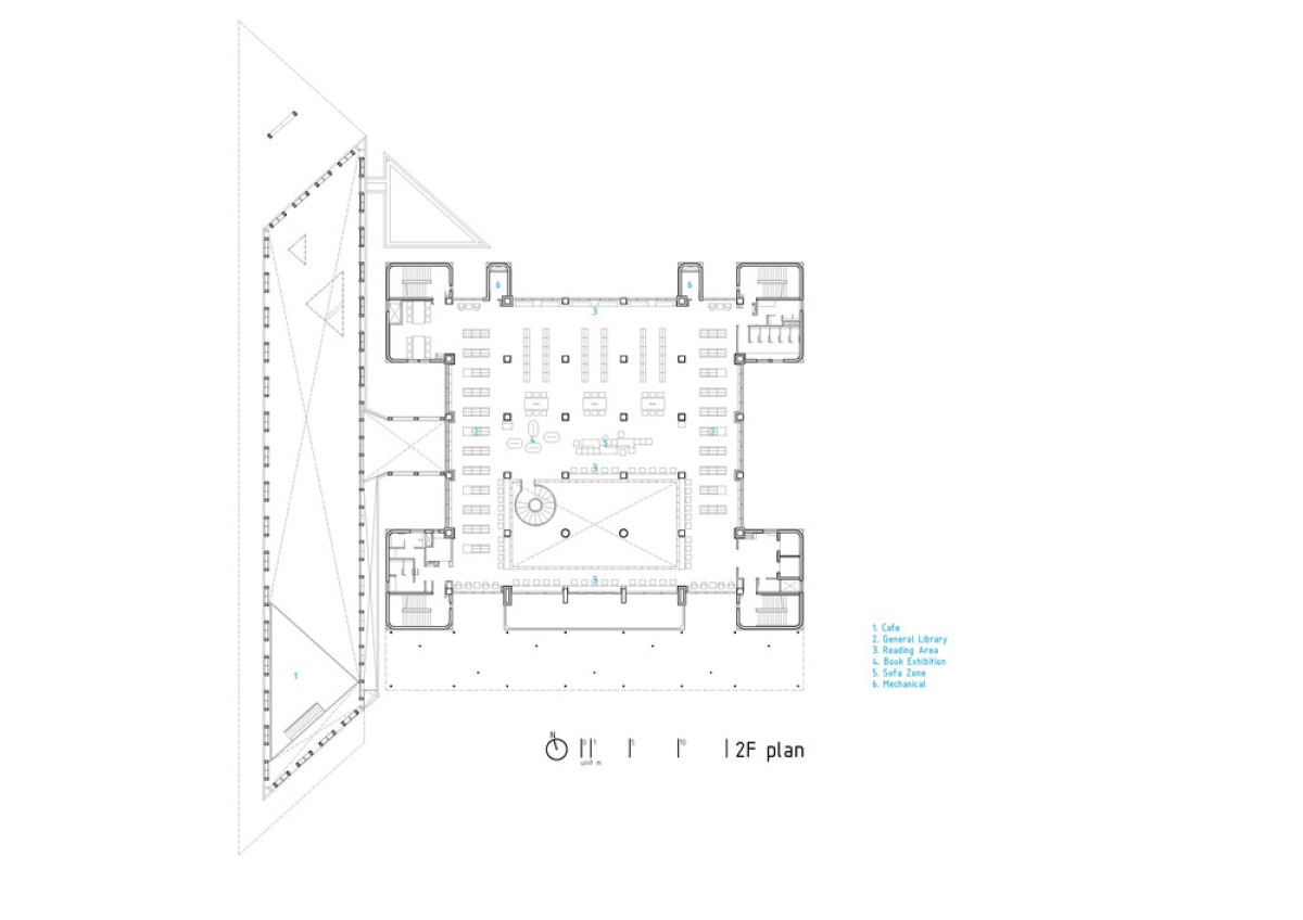 At urban scale, a transparent new lobby is proposed and attached to the western side of the existing building. It turns the architectural axis and approach 90 degree in order to make the library face the city directly. Instead of arriving through a series of formal boulevards and plazas, the new approach guides visitors through the forest and arcades before entering the library. Therefore, the architecture is more attuned to the physical and psychological conditions of contemporary library readers.