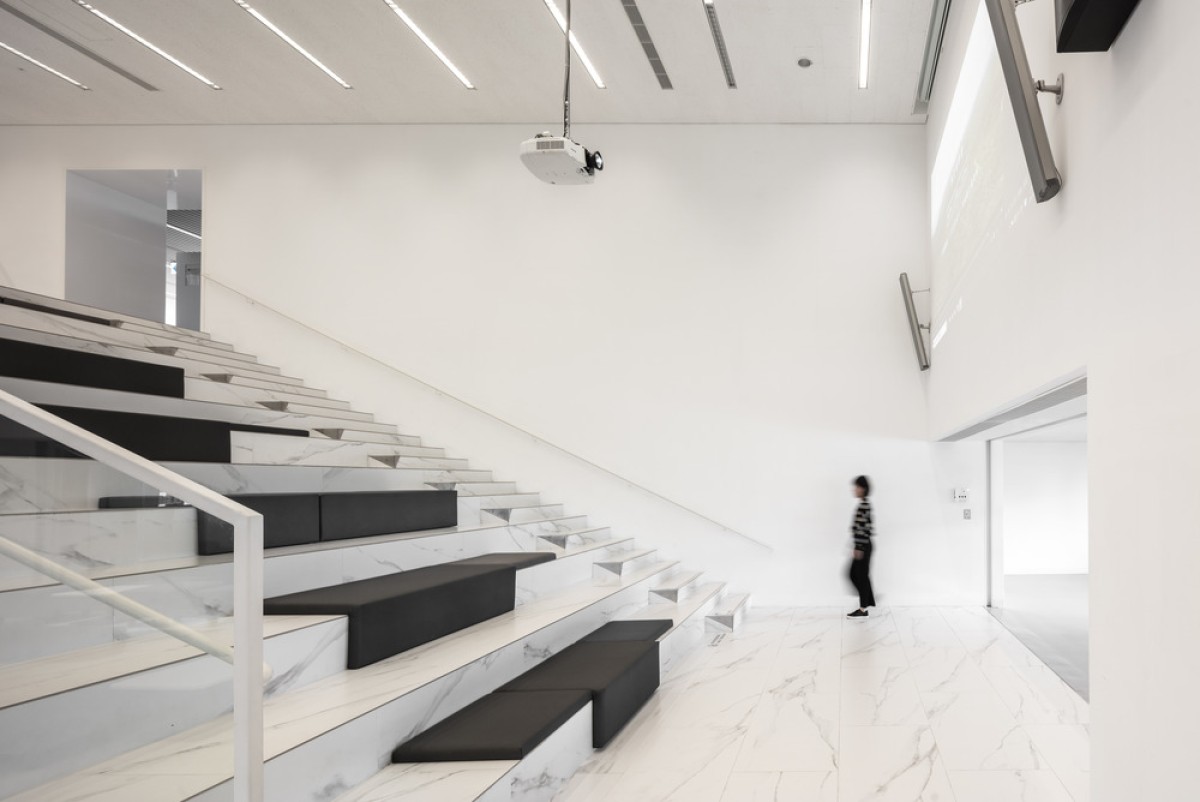 The new lobby consists of a parallelogram plan, and is supported by a continuous V-shaped steel structure. Several “activity Islands” are arranged, including a sunken seating area, a floating mezzanine, and a pair of suspended lanterns. The expanded glass curtain walls link the interior to the exterior, revealing the activities of the library to the city, and vice versa.