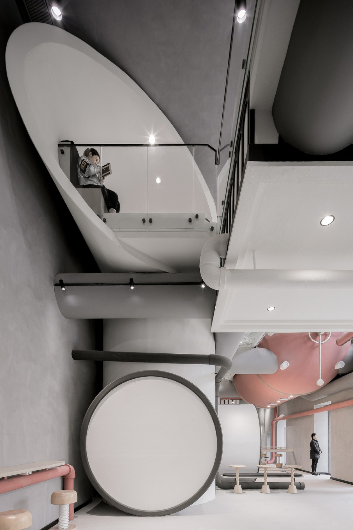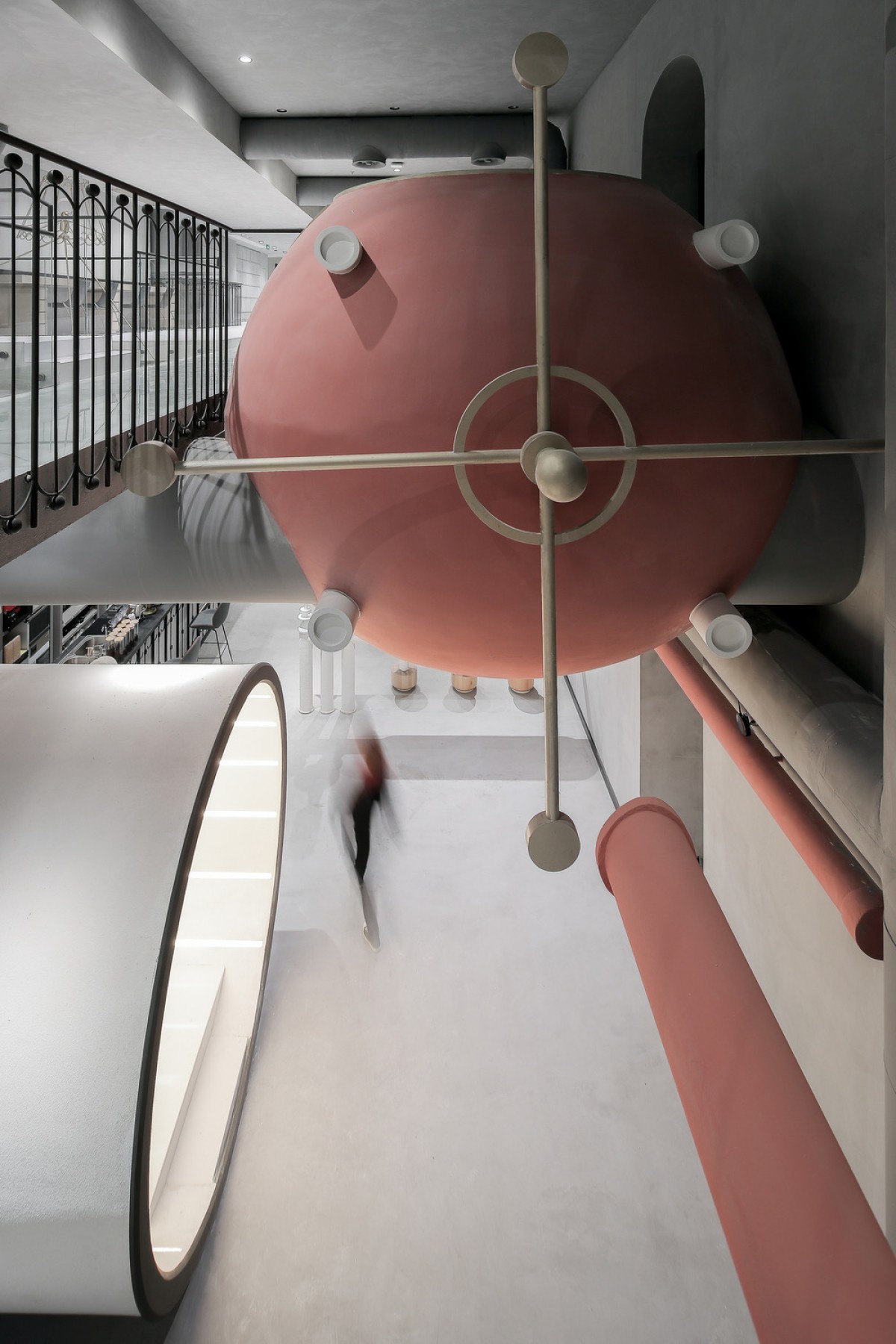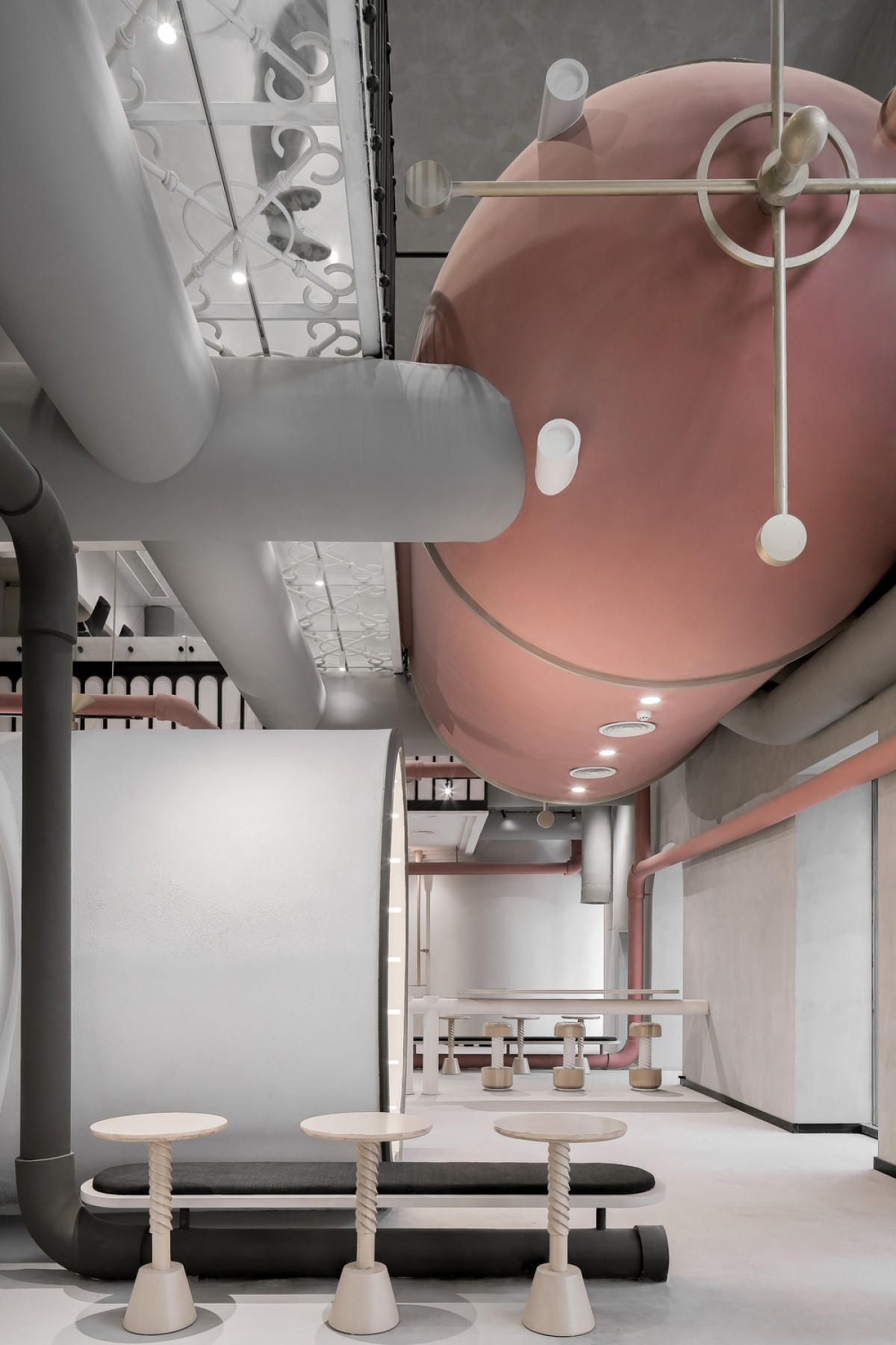 For the shape of the whole space, while factories of the Age of Steam were considered as the prototype, the firm cut off the most complex parts in order to retain only the most basic functional parts, including practical compositions such as reaction tanks, energy delivery pipes, and walking platforms for engineers. These main functional parts also reflect corresponding activities which will occur on the site.