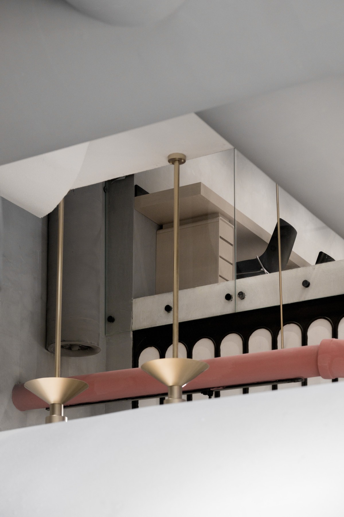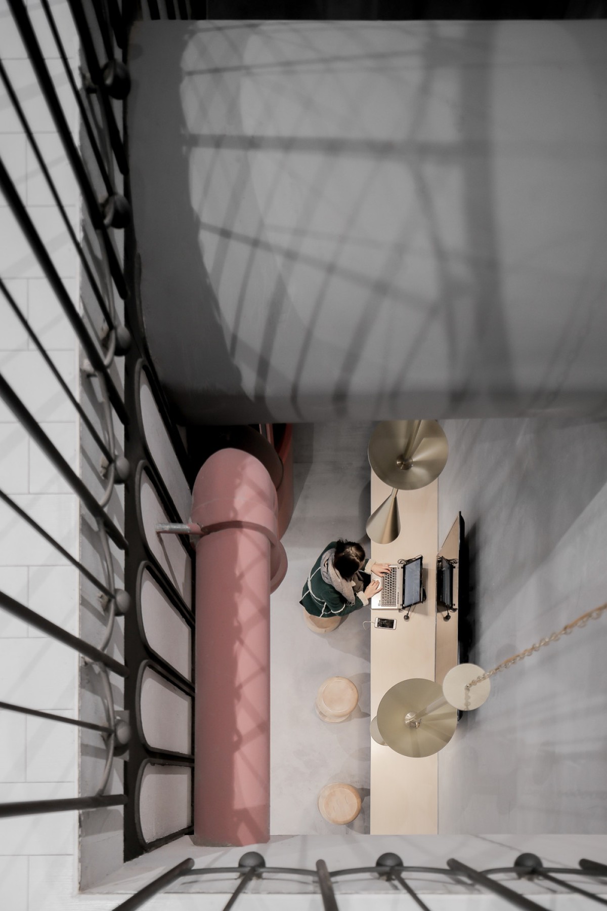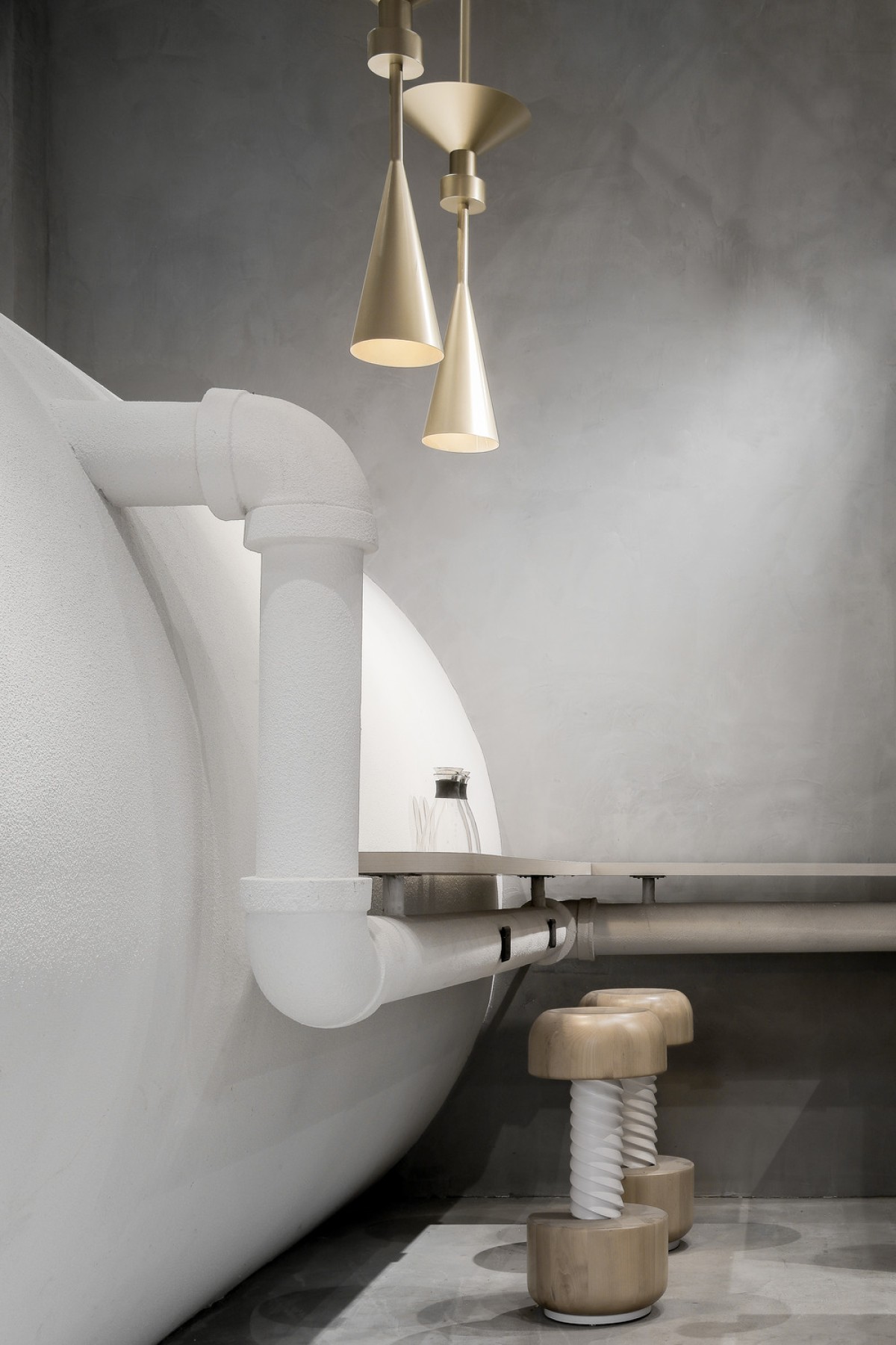 For the shape of the whole space, while factories of the Age of Steam were considered as the prototype, the firm cut off the most complex parts in order to retain only the most basic functional parts, including practical compositions such as reaction tanks, energy delivery pipes, and walking platforms for engineers. These main functional parts also reflect corresponding activities which will occur on the site.