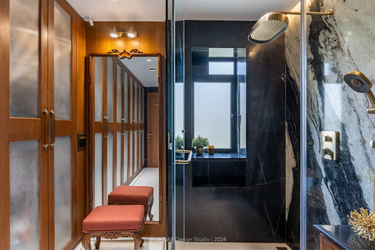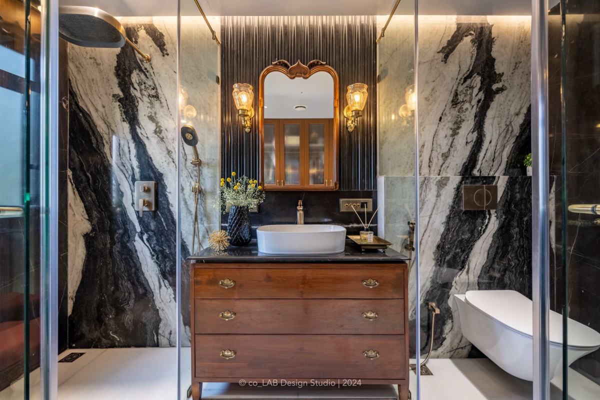 Crafted from exquisite Black Panda marble, the walls exude sophistication, with fluid white patterns cascading gracefully from floor to ceiling. The vertically laid marble slabs in the shower and WC cubicles create a mesmerizing visual effect, accentuating the grandeur of the space.
