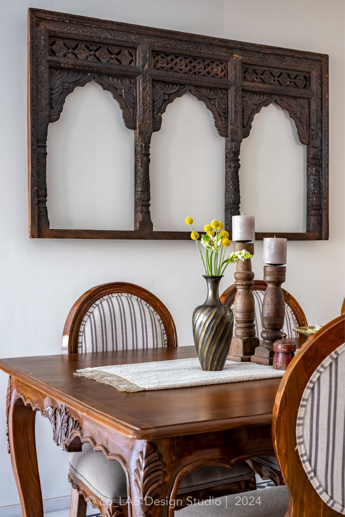A large six-seater dining table commands attention, its carved details on the legs and side panels adding an air of grandeur and sophistication. Wooden chairs, upholstered in striped fabric, invite guests to linger and indulge in culinary delights, while a magnificent wooden Jharokha, intricately carved from mango teak, serves as a stunning focal point against the backdrop wall.