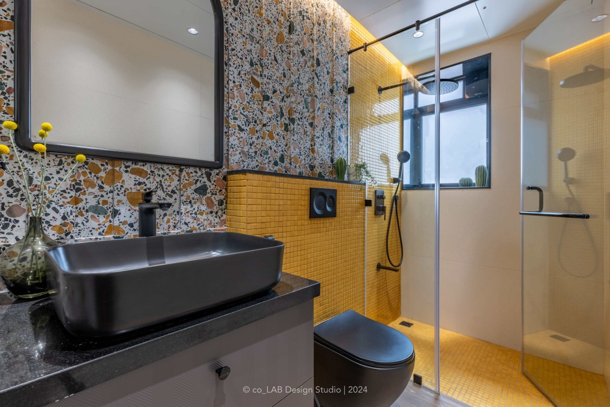 The bathroom too has been made using colourful terrazzo stone in a vertical stepped cladding format and while the chrome yellow mosaic in the shower area acts as highlight to the entire colour scheme keeping the vibe in the toilet both mature and playful. The black matt sanitary fixtures create a contrast to the given material pallet.