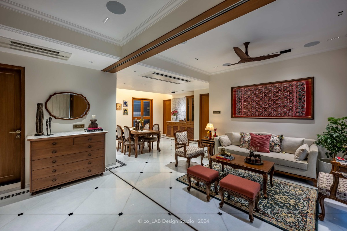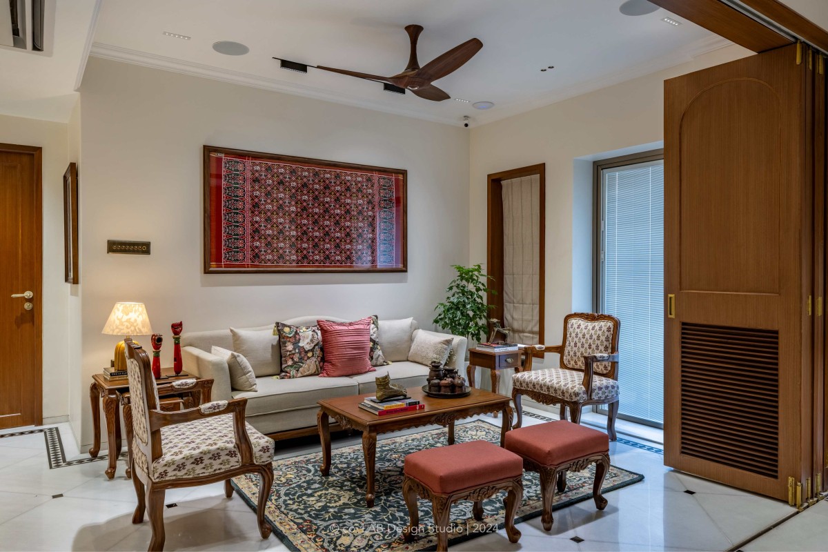 The living room also serves as a multifunctional oasis, seamlessly accommodating a convertible guest bedroom hidden behind a striking sliding folding door. This prominent six-shutter door design finished in wooden moulding, and teakwood louvers, is a testament to exquisite craftsmanship and divides the living space into two halves when required.