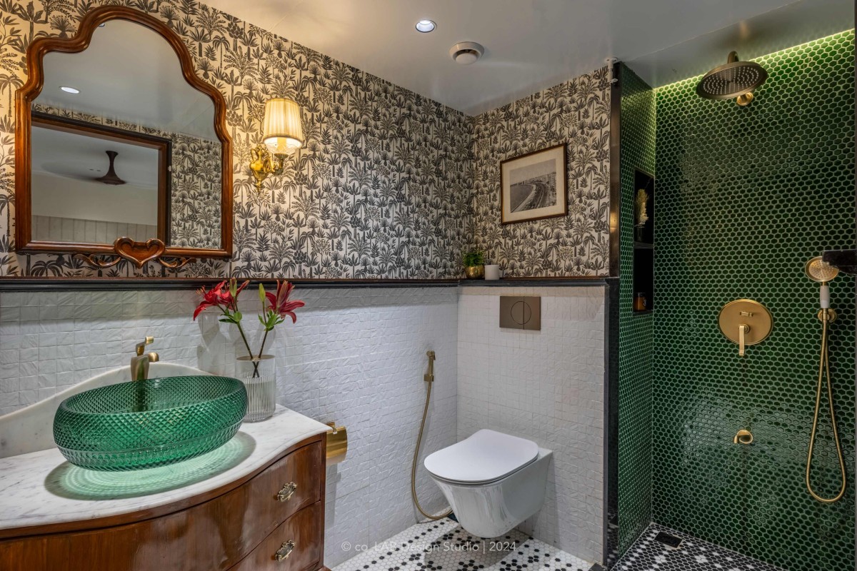 Adjoining the Guest unit is the Powder Toilet of the house. The colour palette, fixtures, wallpaper and overall decor immediately captivates the senses.