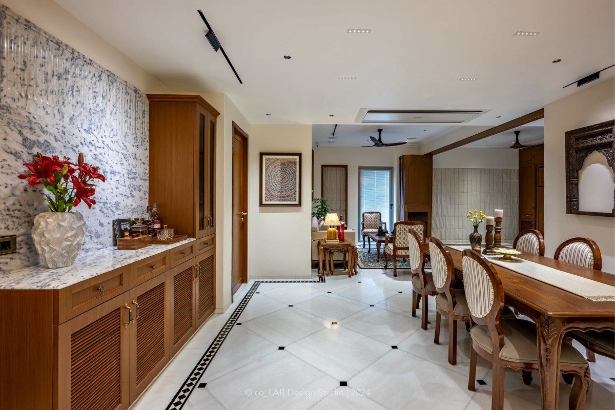 The warmth of Indian teak and veneer infuses the interiors with a sense of richness and depth, seamlessly integrating with the surrounding environment. Each wooden element is meticulously crafted, from the intricate mouldings to the smooth finishes, adding a touch of sophistication to every corner of the space.