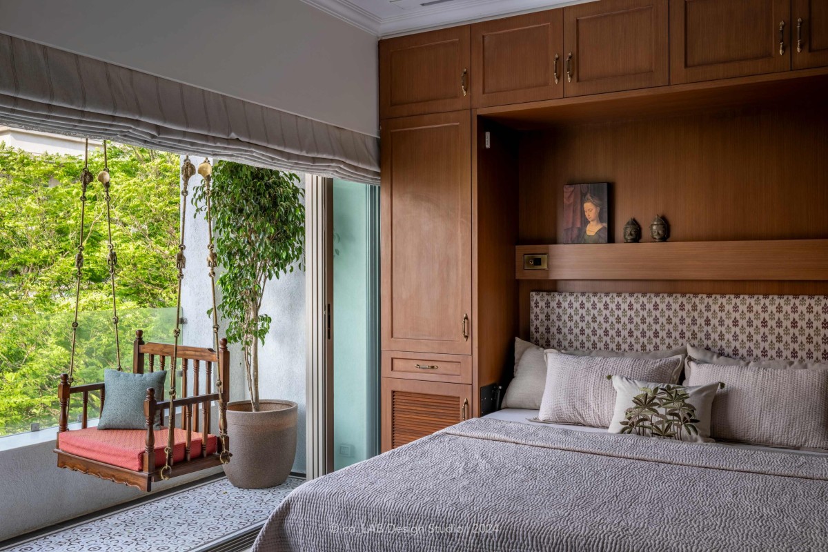 Expanding the grandeur of the living space is a large balcony adjoining the room, offering breathtaking views of the sea and bathing the room in natural light. Here, a charming Jhula beckons, inviting guests to sway gently in the breeze and bask in the serenity of the surroundings. Whether enjoying a morning cup of tea or watching the sunset over the horizon, the balcony seamlessly extends the living space, blurring the lines between indoors and outdoors.