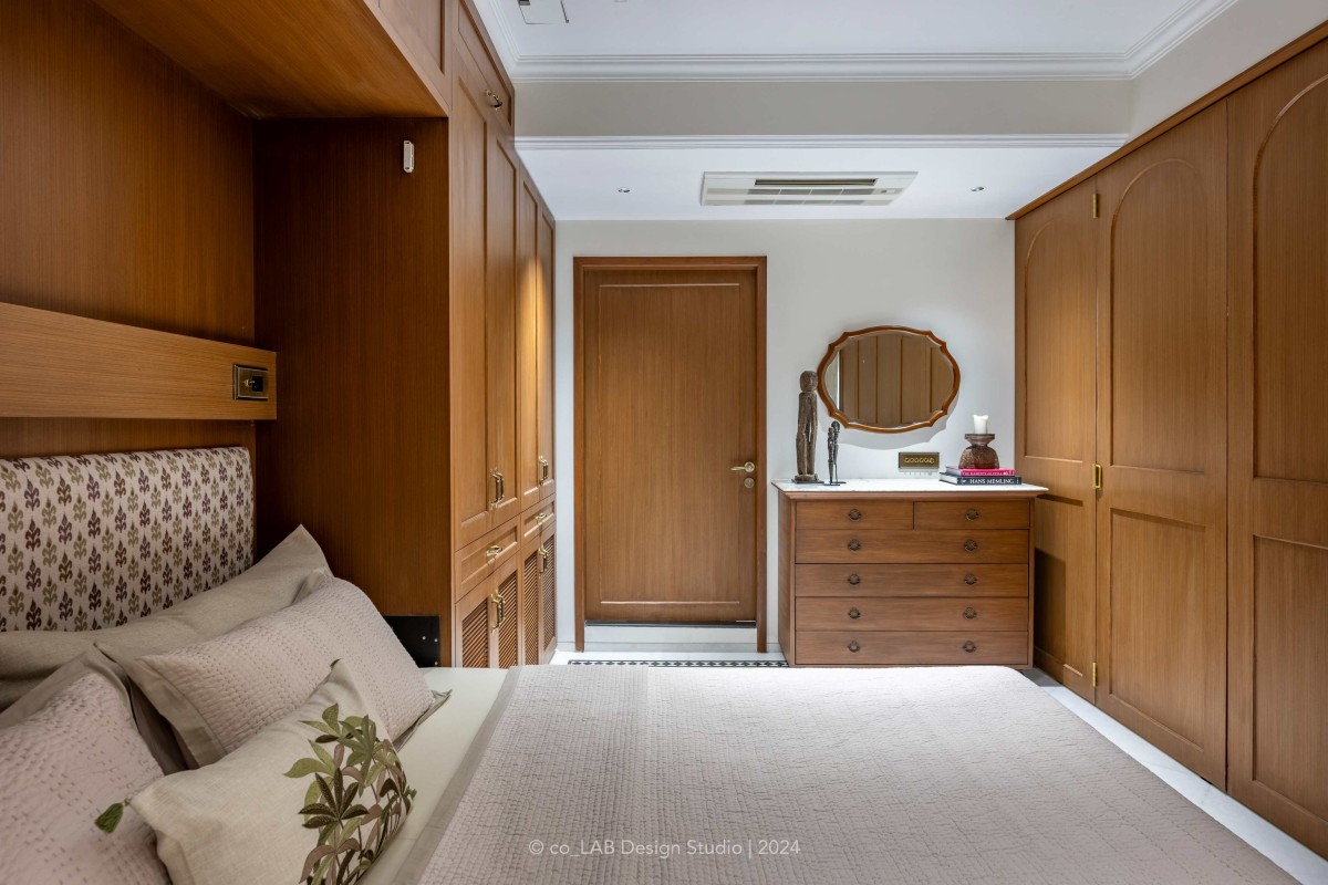 The louvered element is a recurring motif, throughout the space, adorning cabinetries and wardrobes with understated elegance.