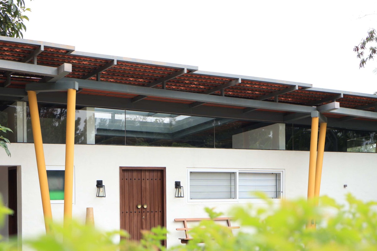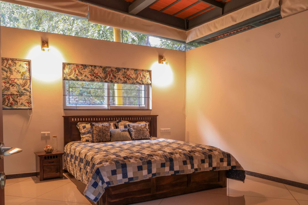 The interiors of the guest house blend rustic charm with modern design elements. Earthy tones and minimalistic furnishings create an ambiance that is cozy & elegant. Natural materials such as wood and stone contribute to a grounded, organic feel. The decor remains understated yet thoughtful, with each piece chosen to complement the overall design narrative. The floating roof adds to the sense of openness, ensuring that natural light filters into the space.
