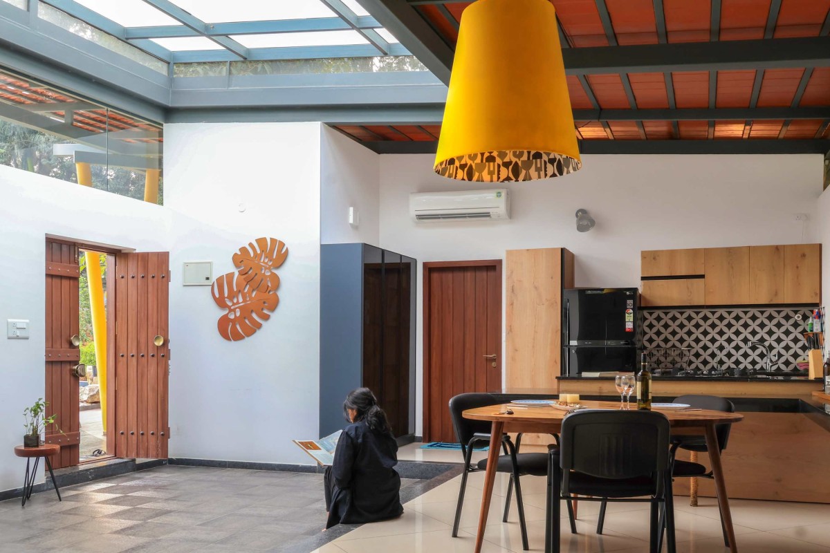 A simple yet inviting entrance leads into a serene courtyard, which forms the heart of the guest house. Here, the design ethos is all about simplicity and tranquility. The courtyard floor is adorned with rough, tactile tiles that add a rustic touch to the ambiance. Above, a well-placed skylight serves as the crown jewel of the courtyard, inviting natural light to cascade into the space. As sunlight filters through, it creates a dynamic play of shadows, adding depth and dimension to the serene setting.