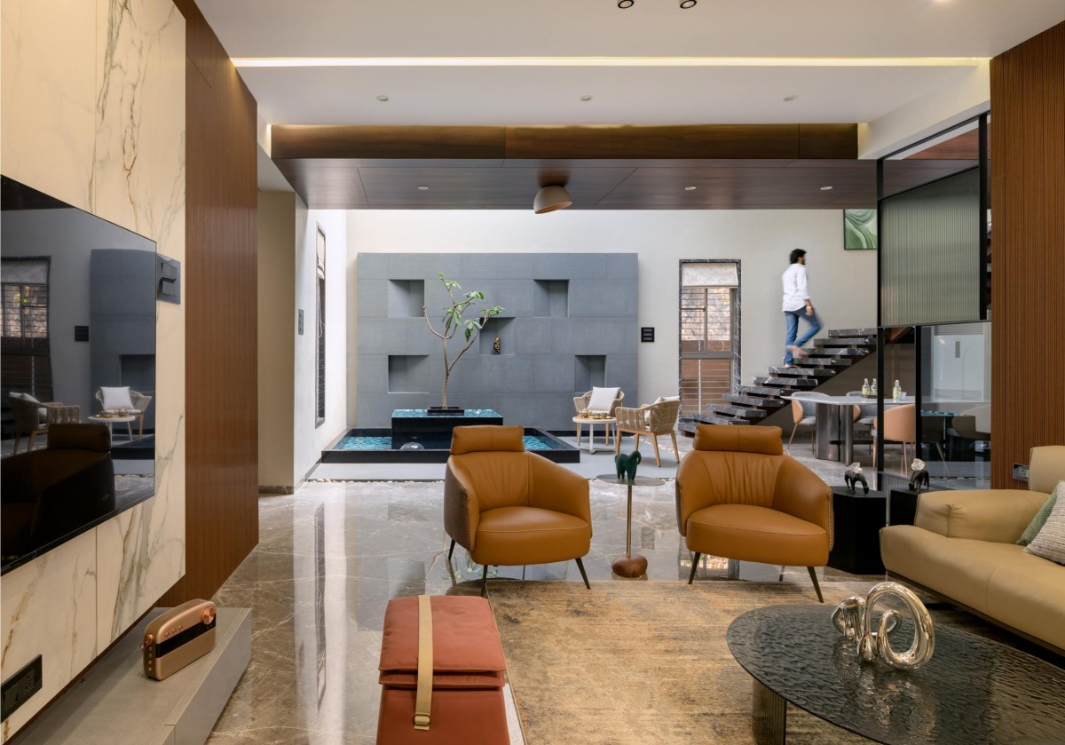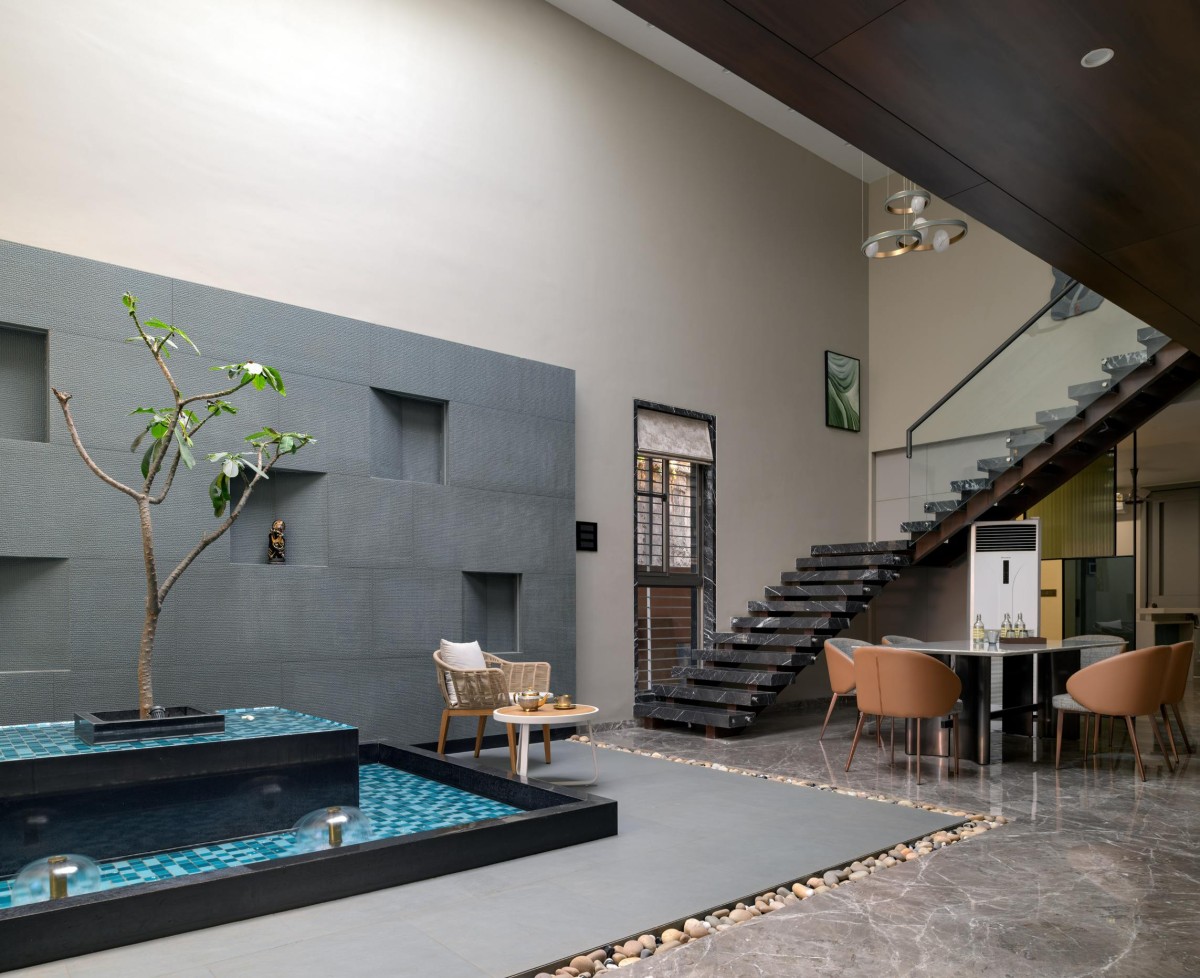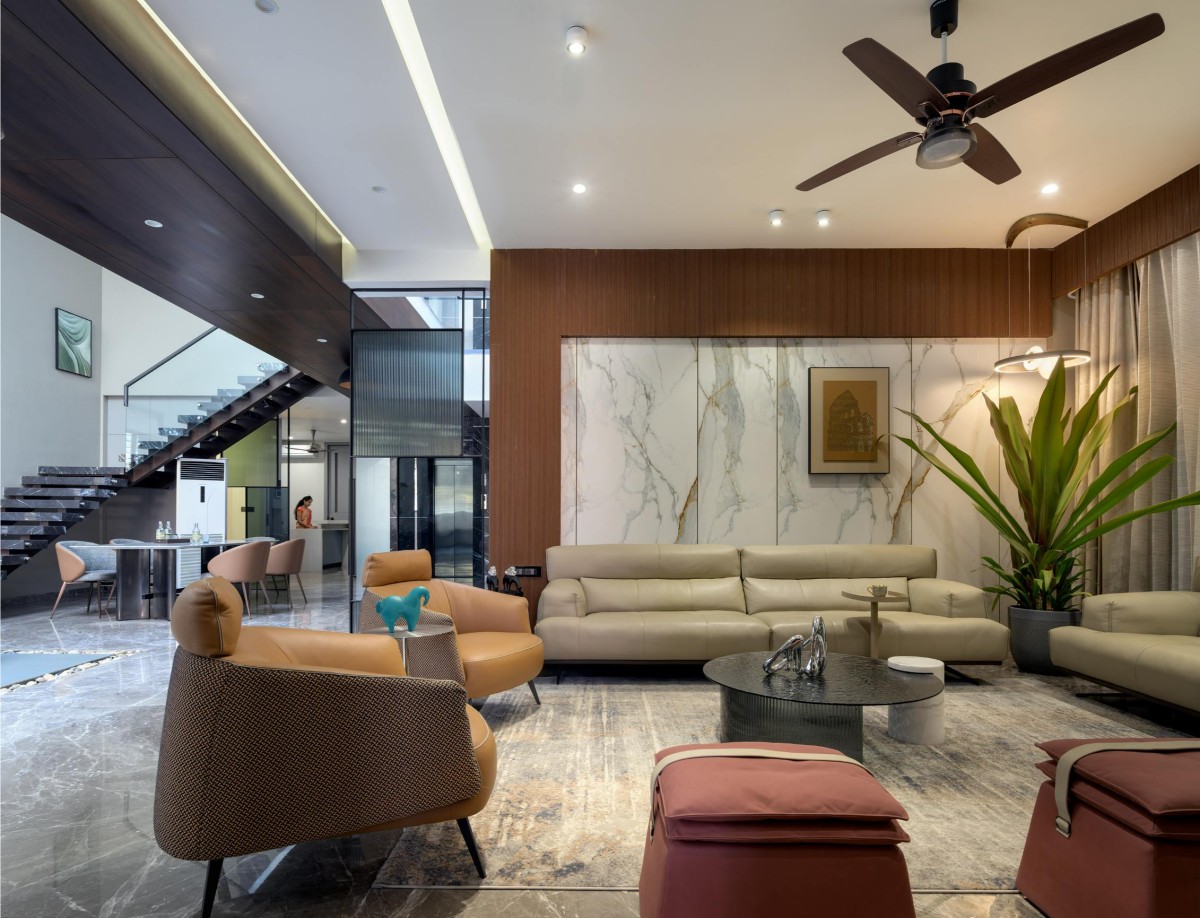 Ramrajya transcends conventional residential design, embracing an ethos of spatial transparency and climatic responsiveness. The strategic juxtaposition of open-to-sky courtyards, double-height volumes, and material contrasts crafts a home that breathes, evolves, and interacts with its environment. Here, architecture is not just about walls and enclosures—it is about orchestrating experiences, framing light, and celebrating the essence of space.