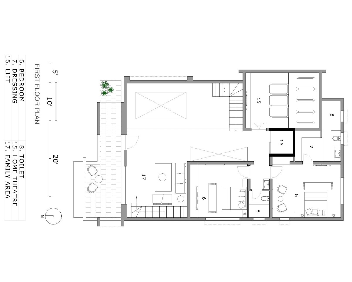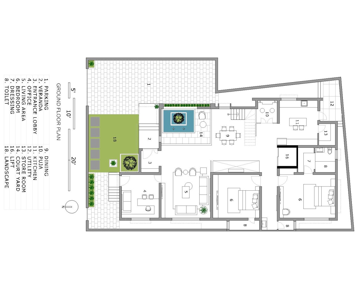 Upon entry, a parking and landscaped garden on the left set a welcoming tone. The living room, discreetly placed to the right, ensures a sense of retreat, while the open-to-sky courtyard and double-height dining area to the left carve an immersive spatial experience. A central open-to-sky cutout, the heart of the home, fosters a seamless dialogue between nature and built form, inviting daylight and natural ventilation into the core.