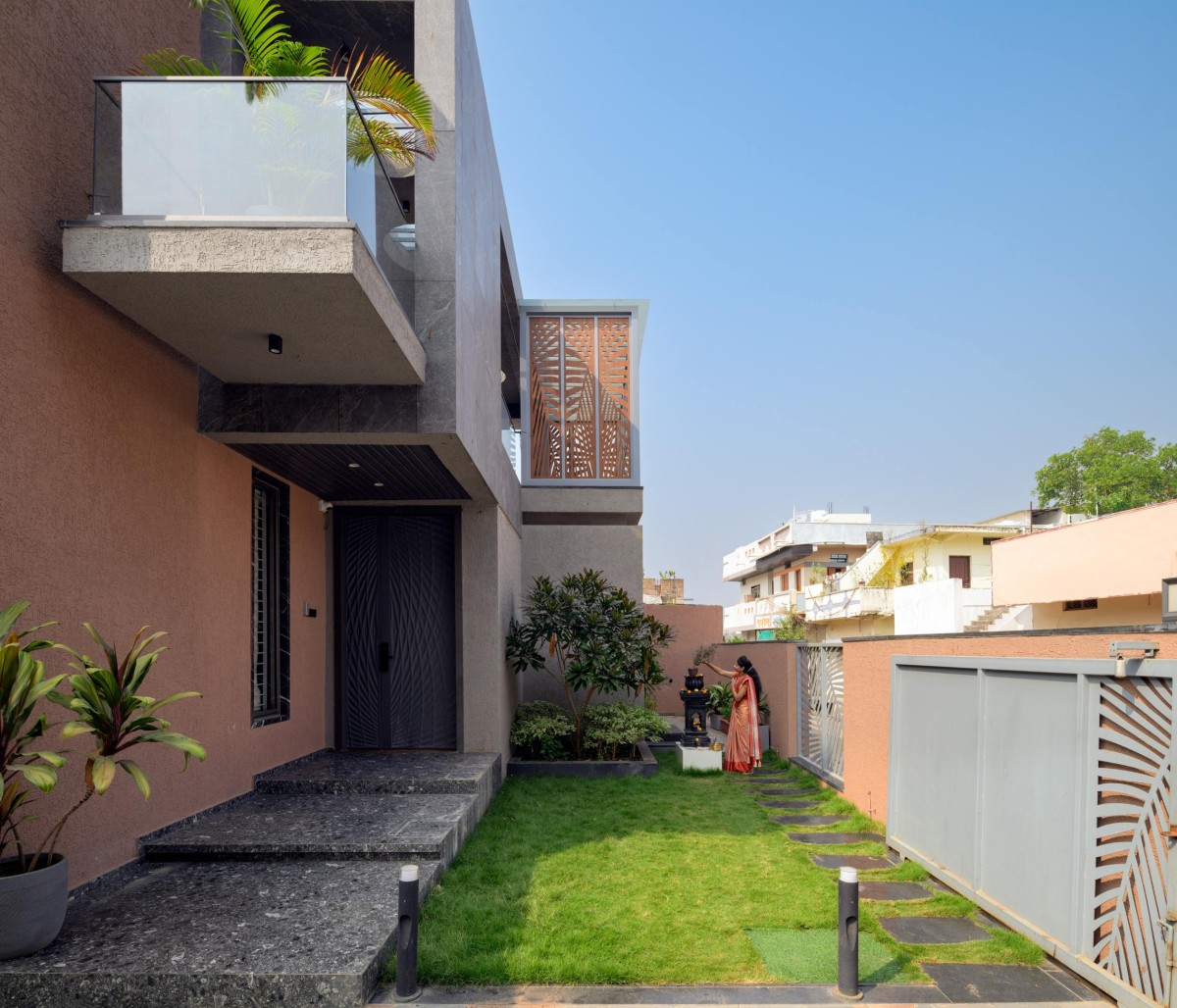 The front elevation of Ramrajya is a carefully composed façade that balances openness and enclosure through material interplay and geometric precision. A defining feature is the half-enclosed balcony, where a perforated jali pattern introduces a layer of privacy while allowing filtered light and ventilation. The other half remains open, creating a dynamic contrast between transparency and opacity.