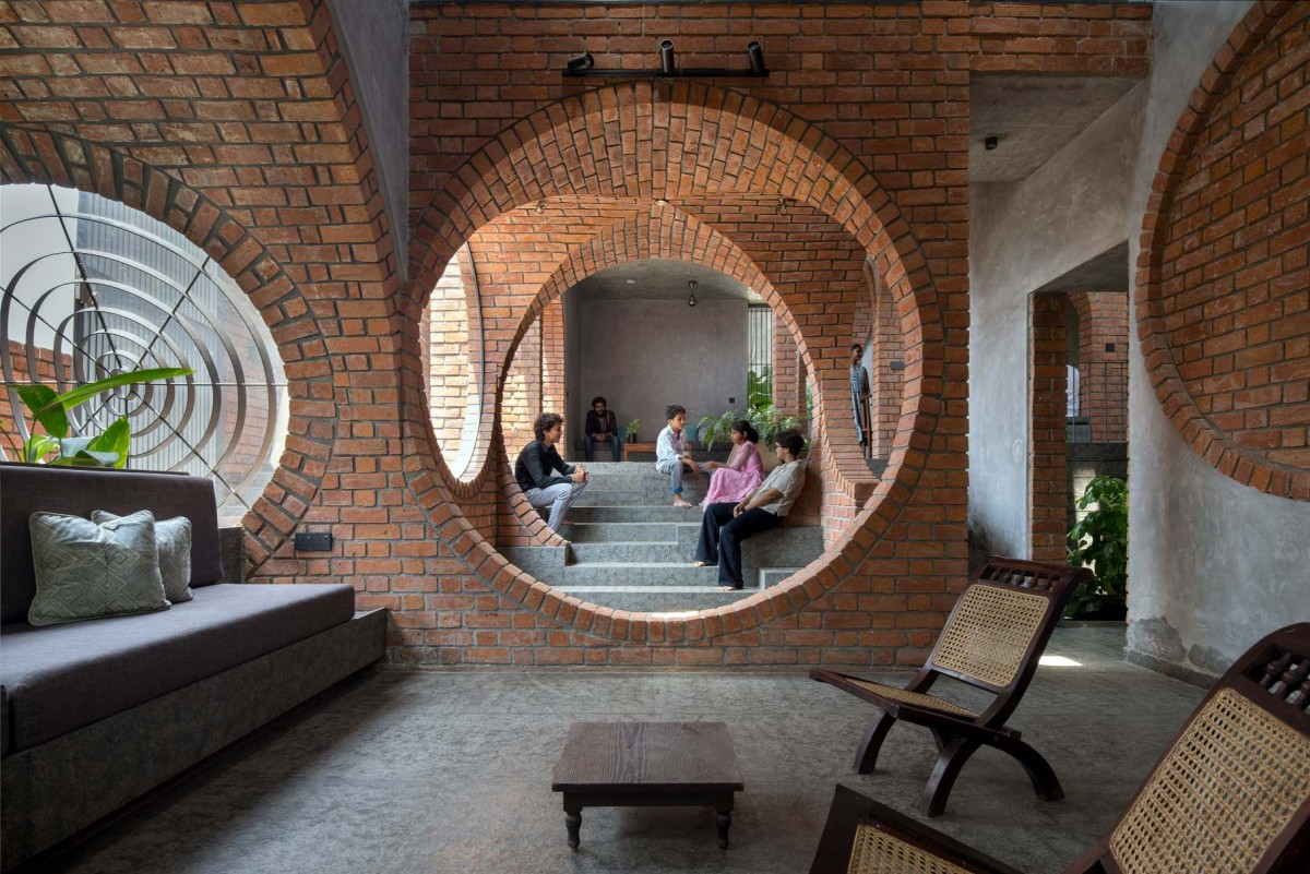 Although internal spaces follow a common grid, each expresses a distinct architectural language. The L-block reveals itself through circular openings, arches, vaults, and niches, lending softness, rhythm, and spatial richness. As this block meets the concrete cuboid, the geometry of openings shifts - arches become straight lines, and curves become planes, marking a subtle transition. The material palette reinforces this contrast: brick brings warmth, tactility, and curvature, while concrete introduces order and stillness. Despite their differences, the two blocks are unified by light, movement, and visual continuity, with the courtyard and staircase mediating between intimacy and openness to form a seamless whole.