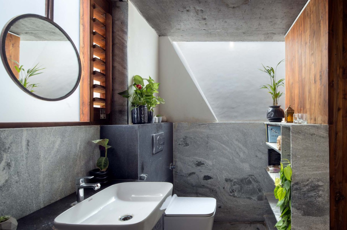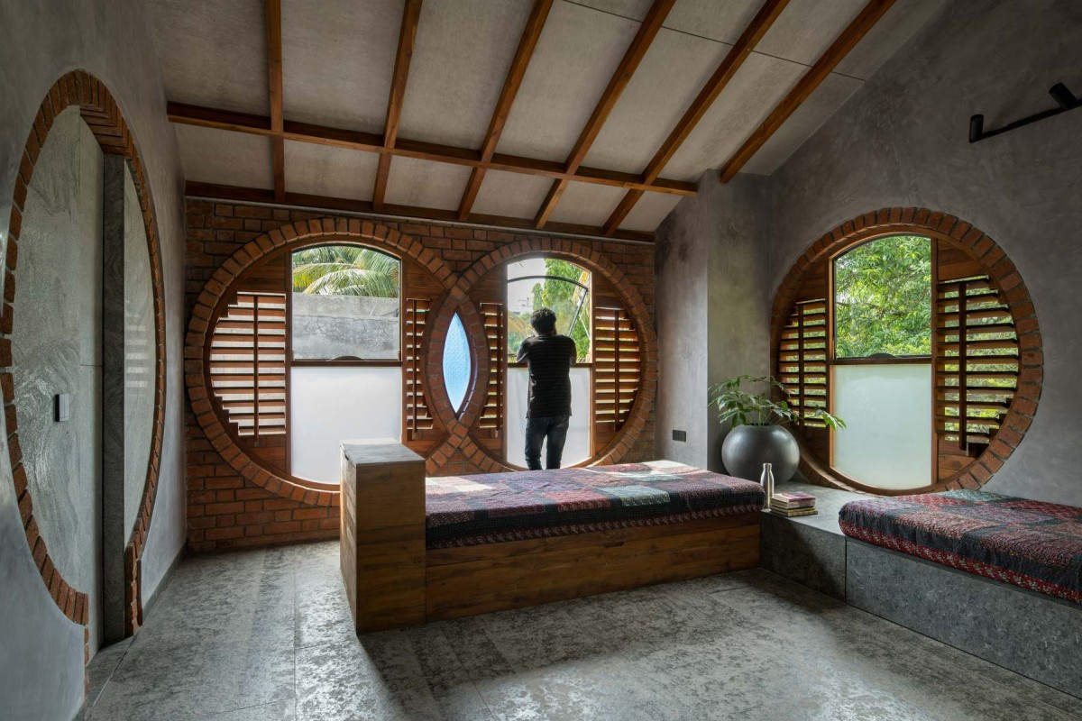 The L-shaped block recalls these traditional sensibilities with its exposed brick walls and a sloping roof that nearly touches the ground. Built with locally sourced brick and crafted by local artisans, it reinterprets vernacular values in a contemporary way. In contrast, the adjoining cuboidal volume draws from the architectural language of the colonial and post-colonial eras. Its 200mm exposed concrete walls reinterpret stone as poured concrete, with layered surfaces and subtle offsets, forming an Indo-brutalist identity. The block concludes with a modest planted terrace offering a quiet pause within the composition.