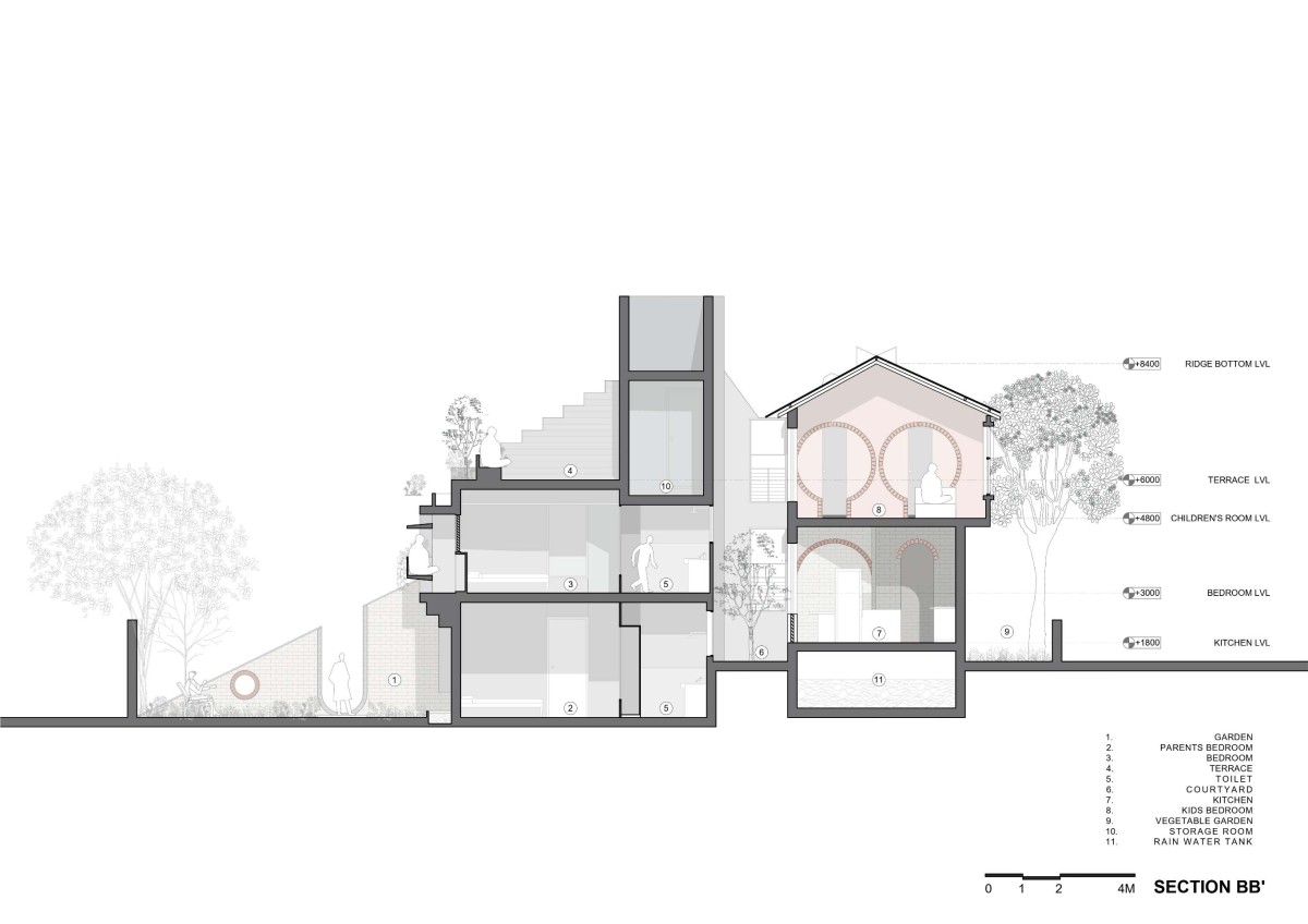 To establish spatial continuity and a cohesive identity, key functions such as the living room, kitchen-dining, family space, and study are placed across staggered levels. These spaces are oriented inward, creating layered visual connections along the central stair.