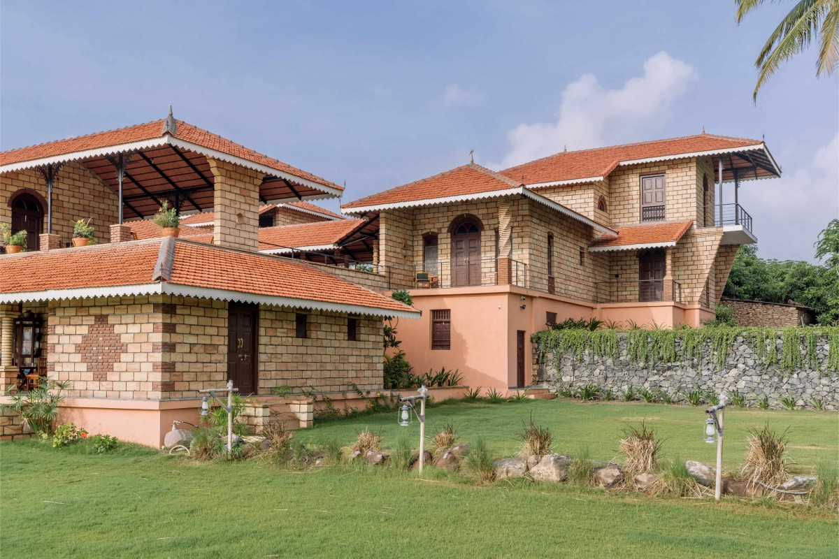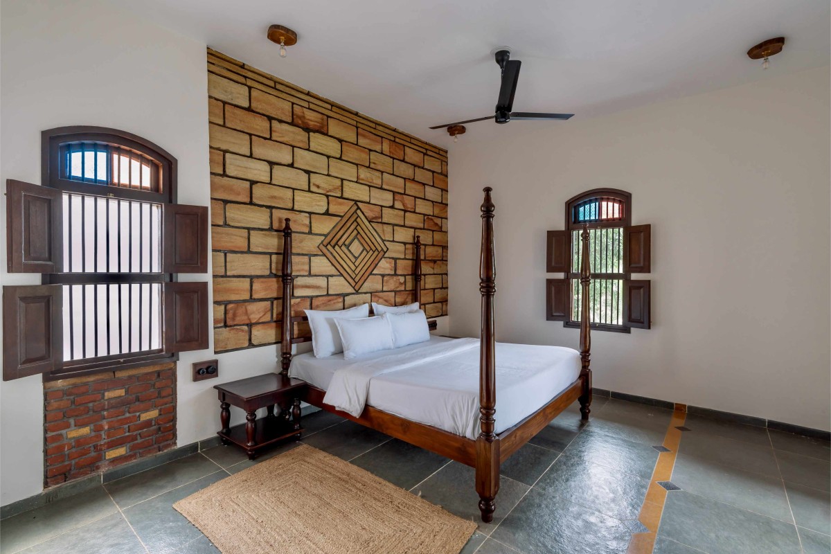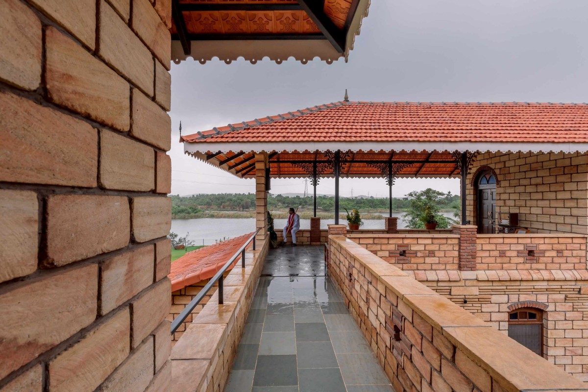 The building derives its strength from load-bearing construction, avoiding RCC entirely and instead relying on a combination of brick and stone. A key design feature is the absence of columns that would otherwise obstruct the view and the balconies are structurally designed with corbelling techniques, allowing for unobstructed panoramas. The infinity pool, positioned towards the edge, merges seamlessly with the landscape, ensuring the architecture never overpowers its natural surroundings. Materiality is integral to the design philosophy. The project extensively uses recycled local materials, particularly old teakwood doors and windows, which are sourced and repurposed to maintain authenticity. These doors feature kamans (arches) above them, supported by brick and stone columns, reinforcing the tactile quality of the space. Sandstone dominates the built fabric, ensuring continuity in material and craftsmanship while also allowing for diverse forms and detailing. Experimenting with visual details onsite is a significant way of working for Himanshu’s practice like surface patterns, incorporating niches or details which adds a celebratory character to the space, making it dynamic and responsive to the traditions it seeks to uphold.