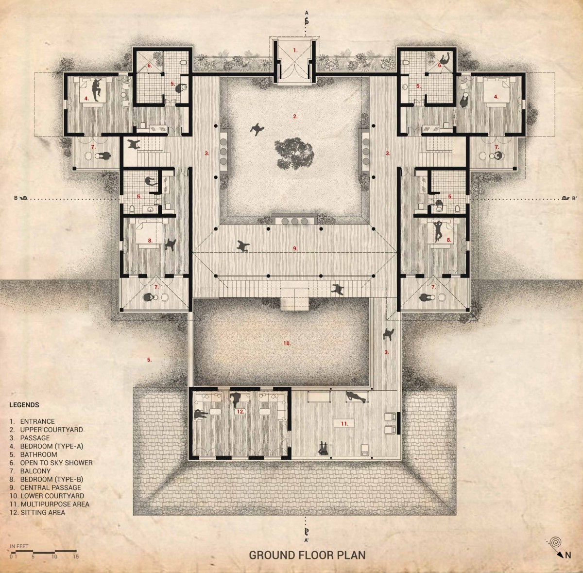 This play of levels also influences the microclimate—while the upper semi-covered spaces provide shade and openness, the sunken courtyard remains naturally cooler, creating a comfortable retreat from the heat. Through this thoughtful layering of spaces, the homestay achieves a seamless blend of function, symbolism, and environmental responsiveness.