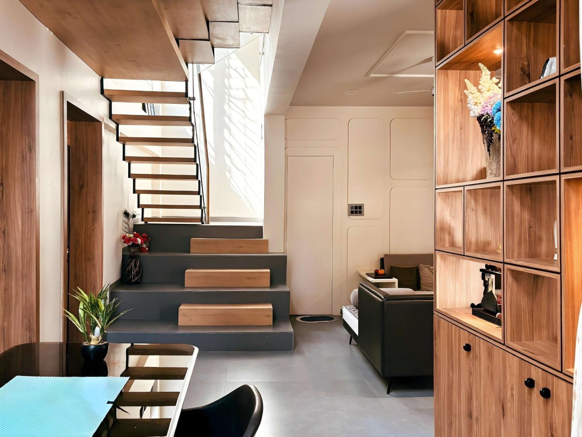 The client sought a warm, modern home with ample daylight, clean aesthetics, and seamless spatial flow—crafted for comfort, simplicity, and elegance. SAKSHAM is a celebration of light, texture, and spatial harmony. At the heart of the home stands the floating staircase—designed as the hero element, blending minimalism with sculptural presence. Clad in matte black and natural wood, it connects levels while anchoring the entire design language around its bold, linear geometry.