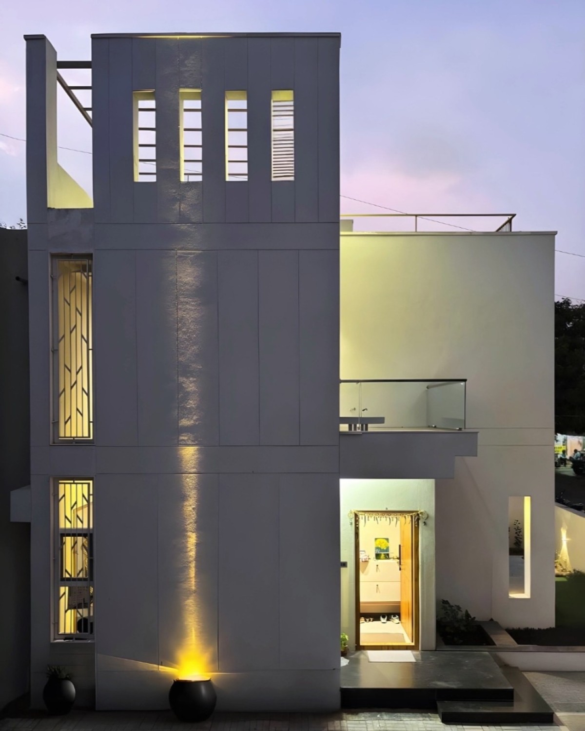 Dusk light exterior view of Saksham by DESiGN fEEDER Architects