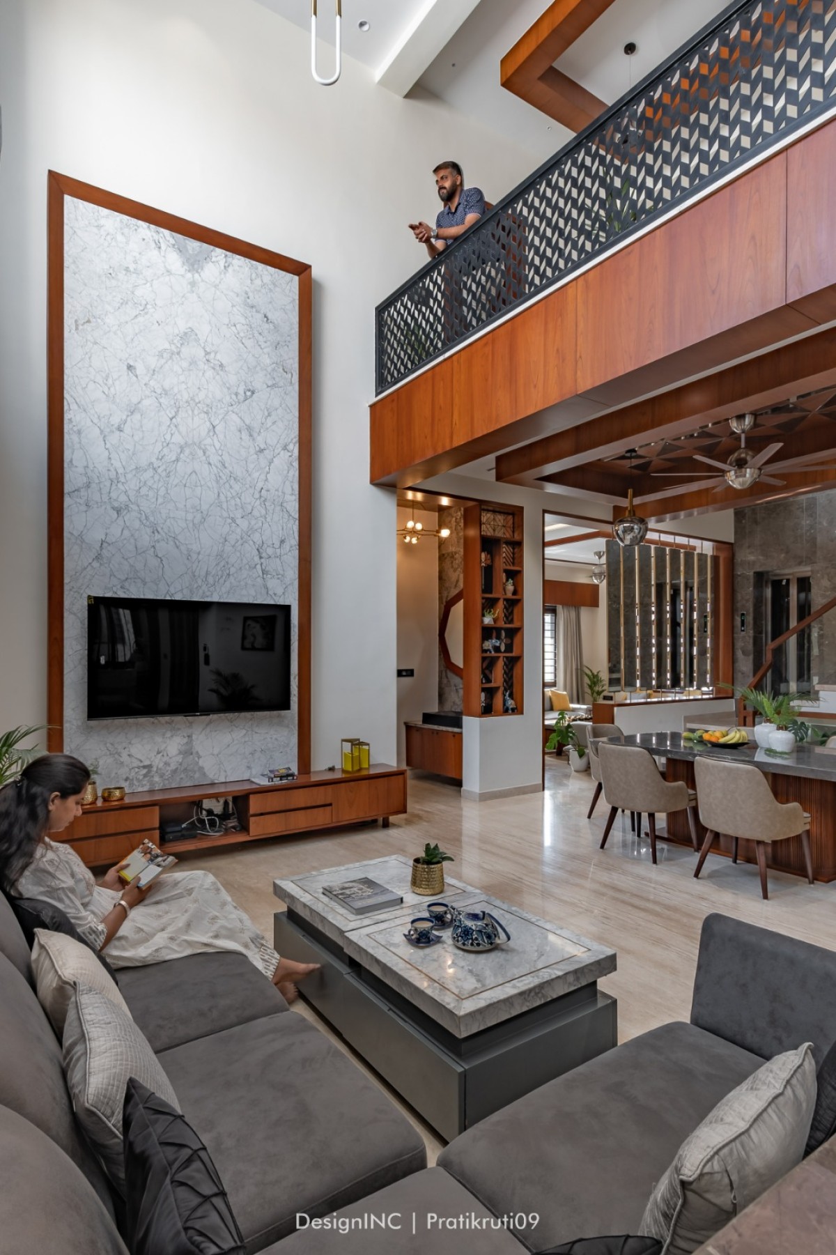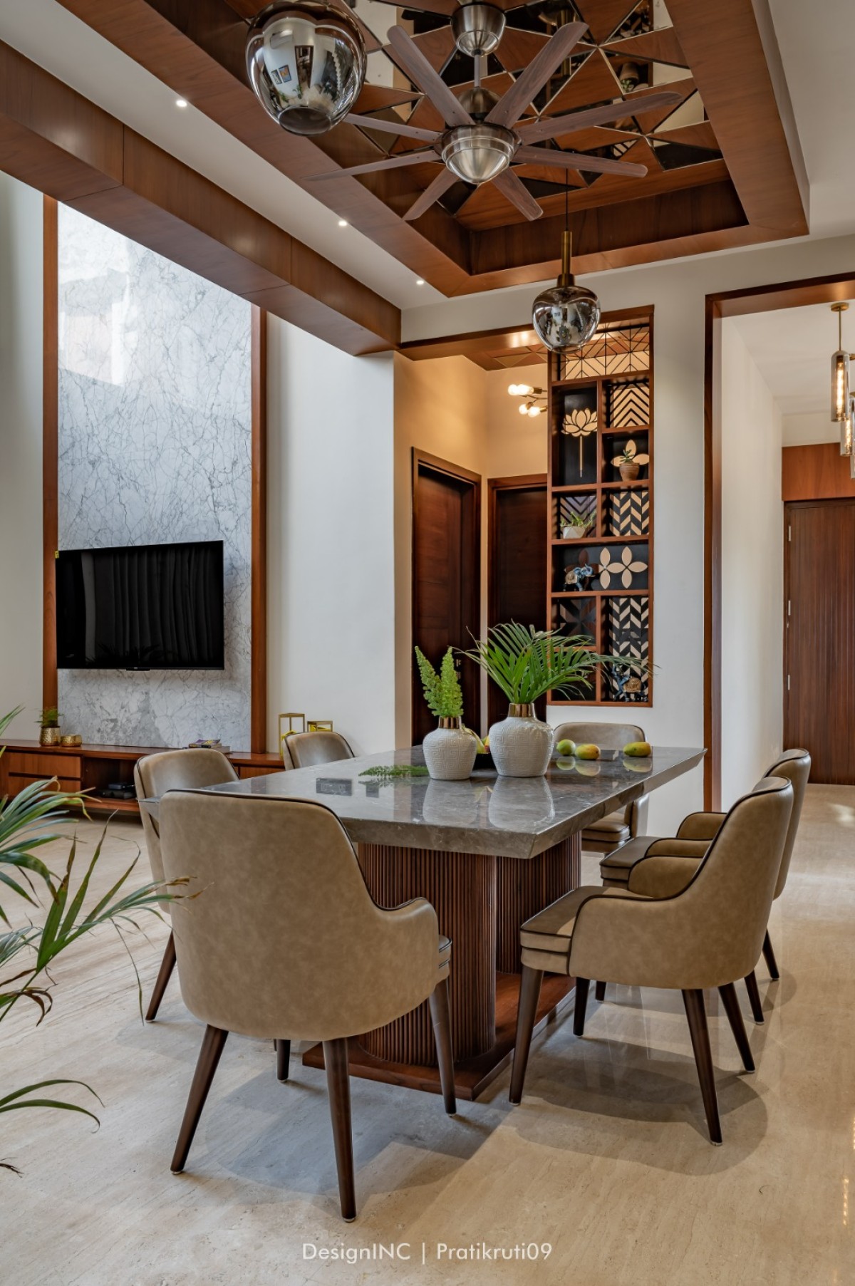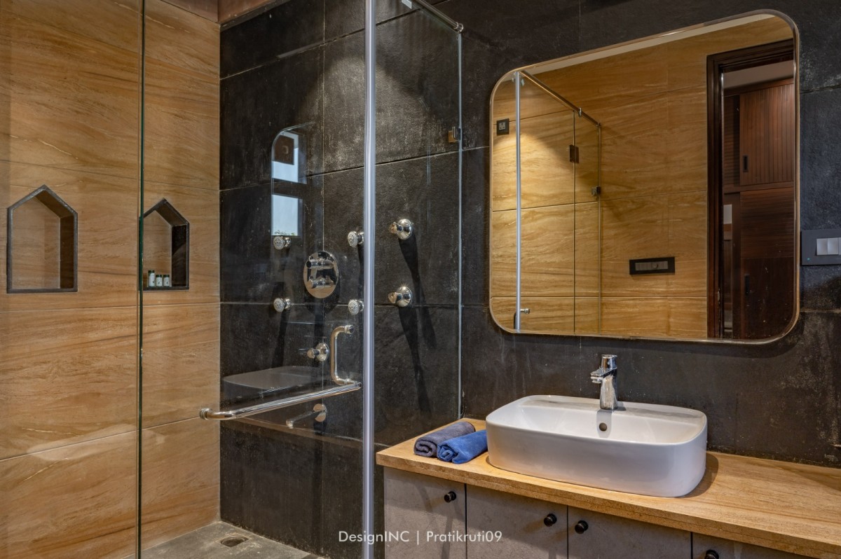 Achievement of balance by using stone on the lower levels and gradually transitioning to neutral shades on the upper levels has created a visually appealing composition. Balance has been ensured between the use of brick and mirror elements. Too much mirror can create an overwhelming effect, so it has been used strategically as accents and feature pieces in common spaces such as drawing partitions and dining ceiling.