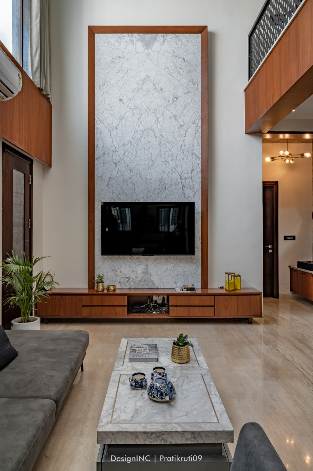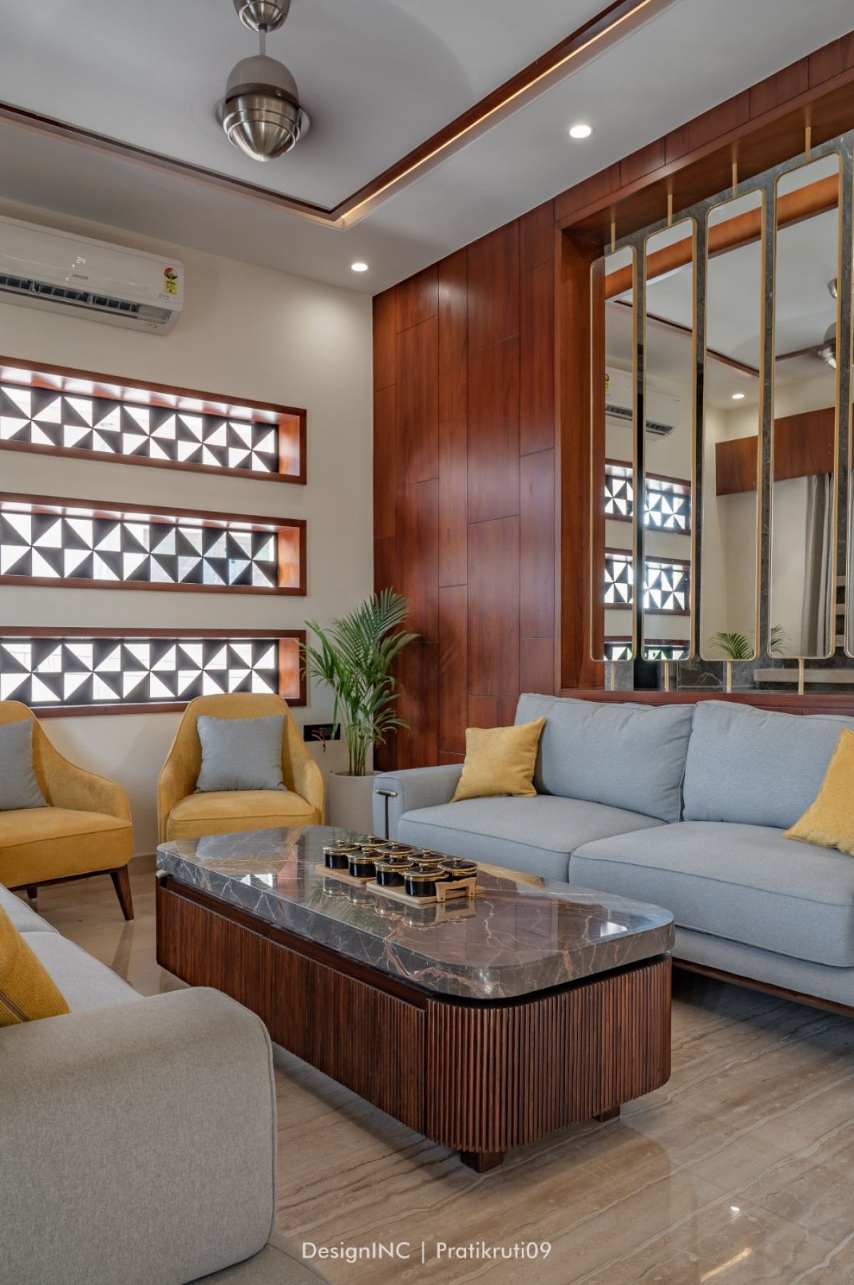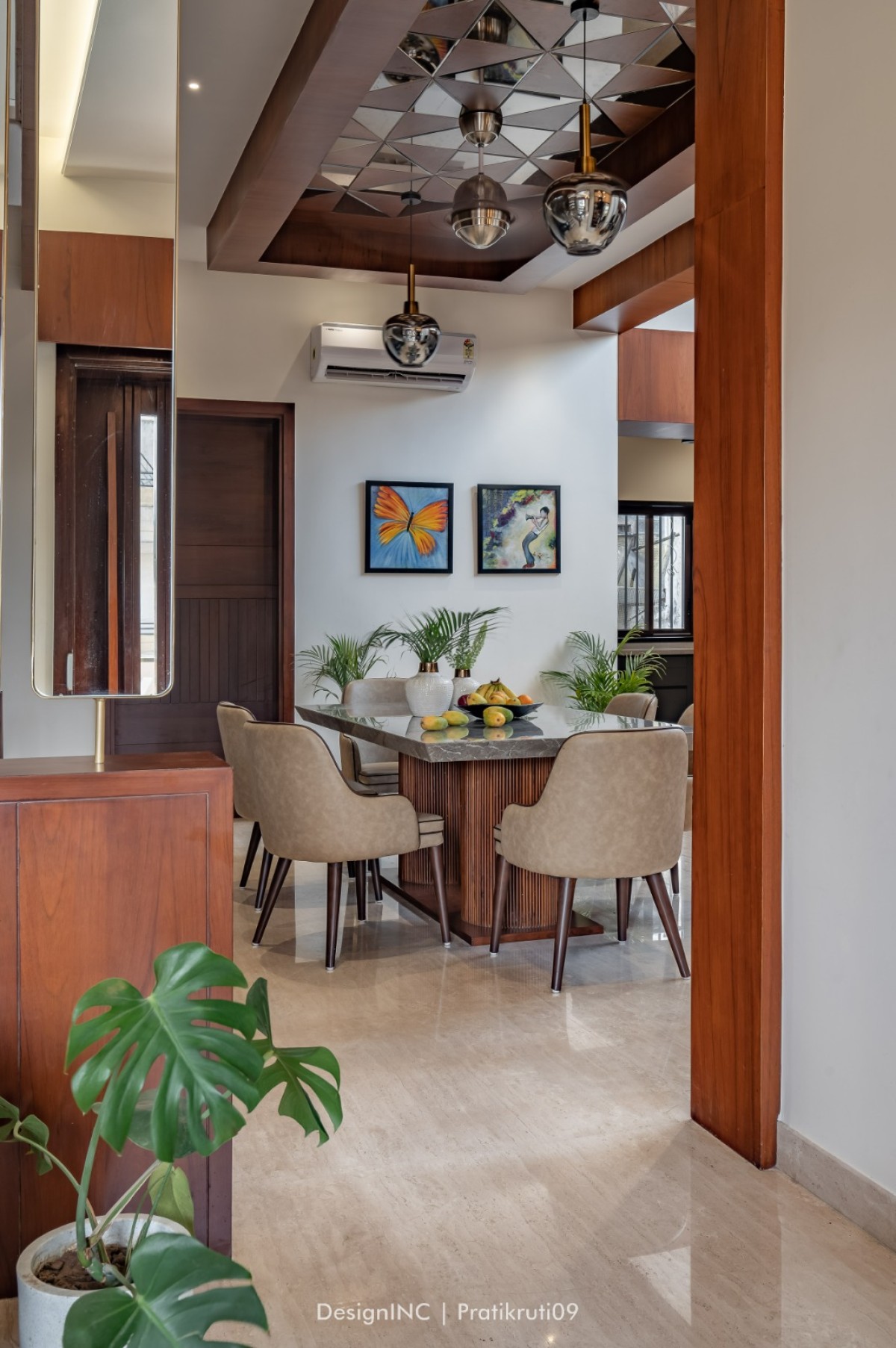 Achievement of balance by using stone on the lower levels and gradually transitioning to neutral shades on the upper levels has created a visually appealing composition. Balance has been ensured between the use of brick and mirror elements. Too much mirror can create an overwhelming effect, so it has been used strategically as accents and feature pieces in common spaces such as drawing partitions and dining ceiling.