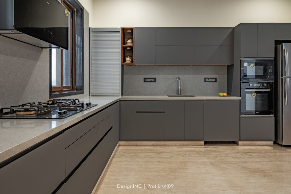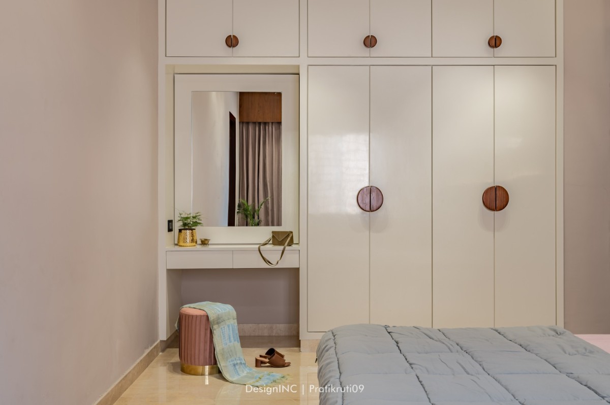 Furniture and décor pieces that complement the neutral colour scheme have been selected skilfully. Comfortable and stylish furniture with clean lines and neutral upholstery has been used to add to aesthetic appeal of the space. Addition of pops of colour through accent pieces, such as cushions, rugs, or artwork, to break the monotony of the neutral palette has created bit of playfulness in the bungalow.