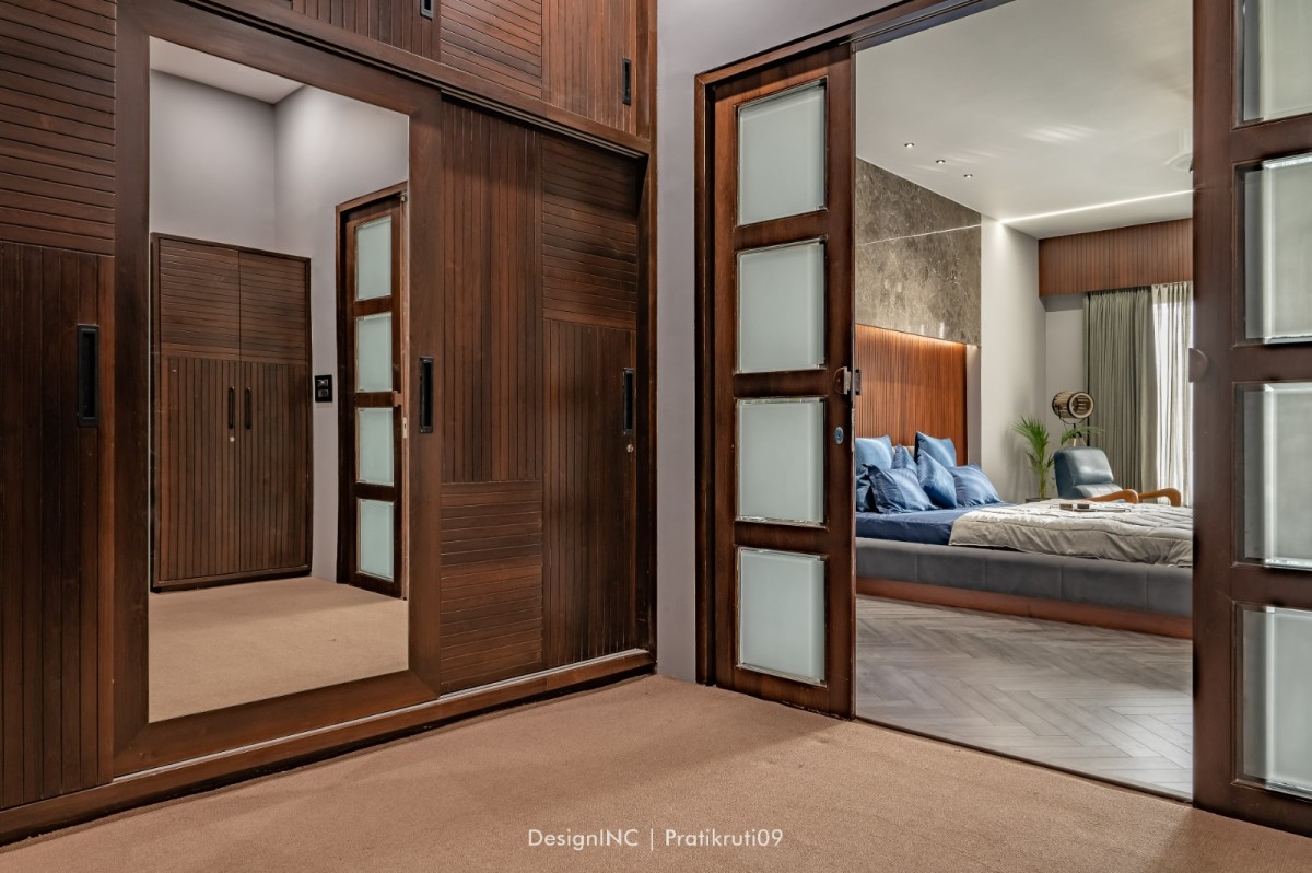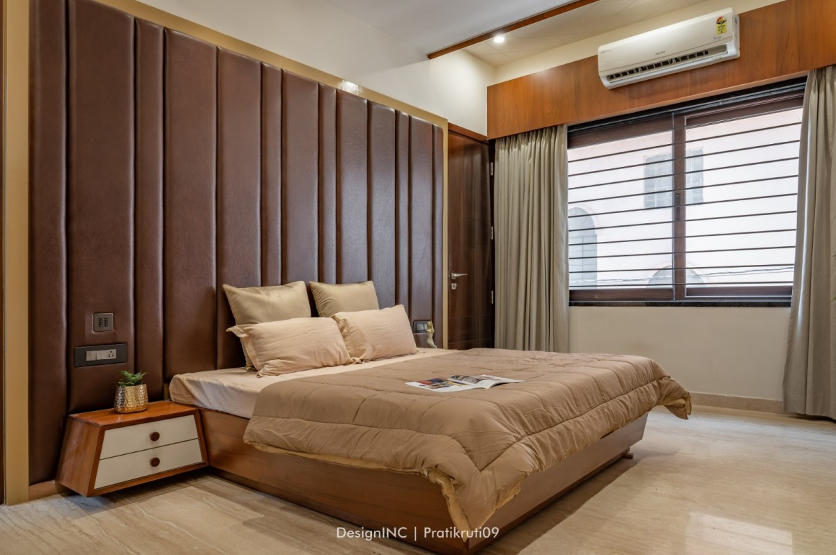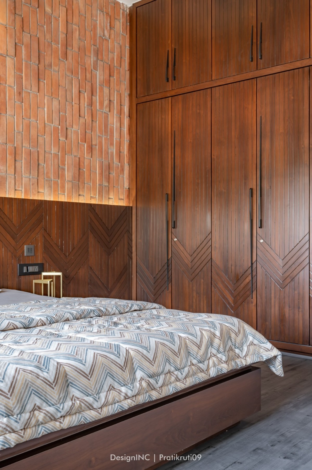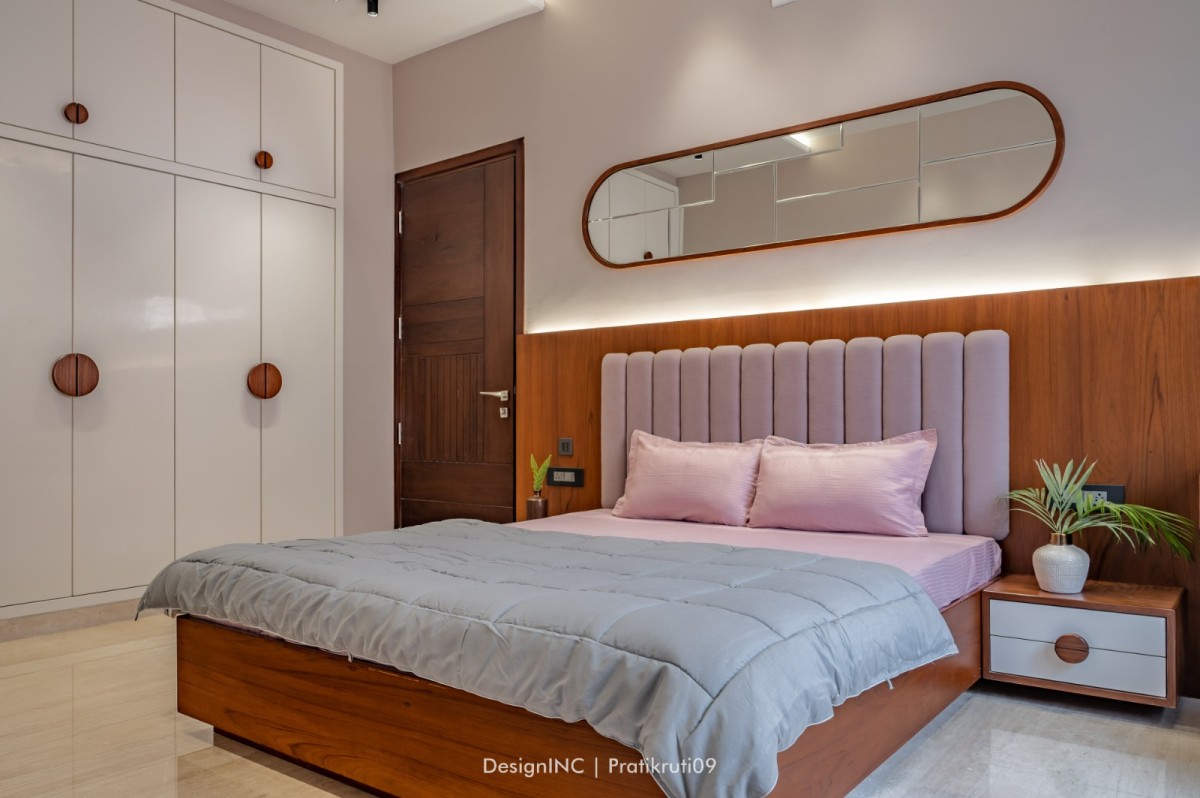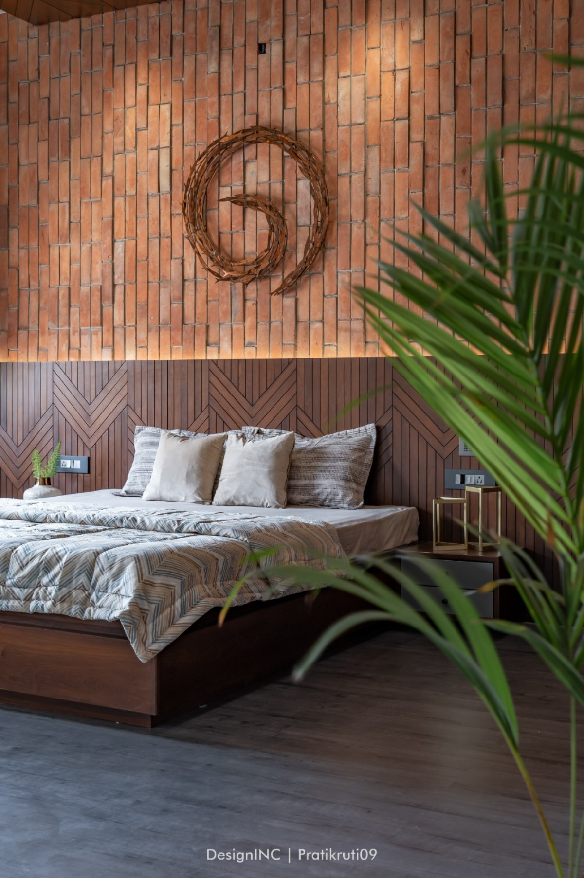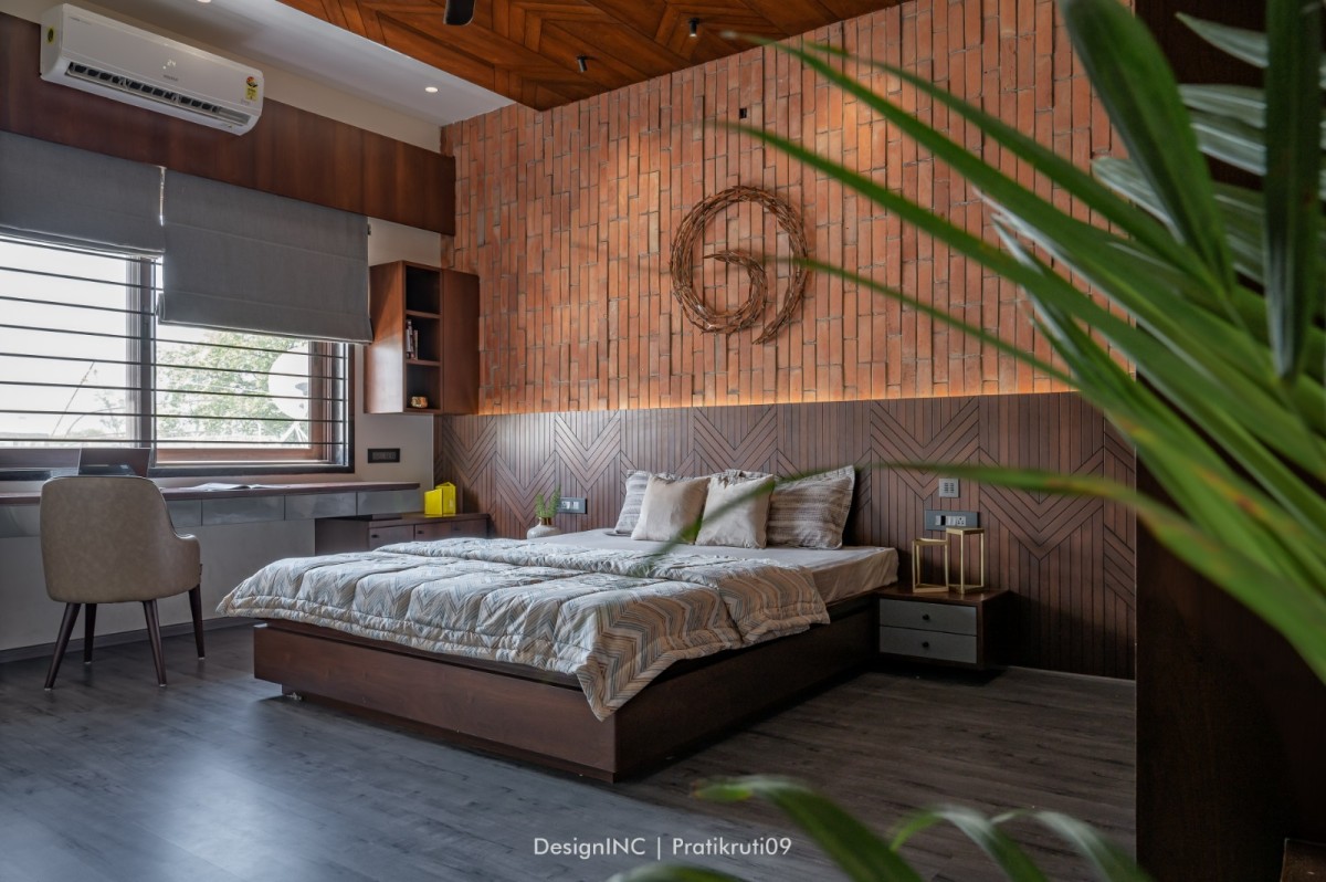 Mirrors have been utilized strategically to enhance natural light and create an illusion of larger spaces. Placement of mirrors opposite windows and in darker areas to reflect light has made the interiors brighter. Incorporation of large windows throughout the bungalow to maximize natural light and provide a connection to the outdoors is practised across all liveable spaces. The reflection of natural light on brick surfaces in bedroom has added warmth and character. Textural variations in the brickwork have improvised visual interest in bedroom. Contrast worked on by incorporating sleek and reflective surfaces like mirrors alongside the rough and earthy texture of bricks has brought a modern touch to the design. Ample concealed light has been used for proper functioning of home theatre.