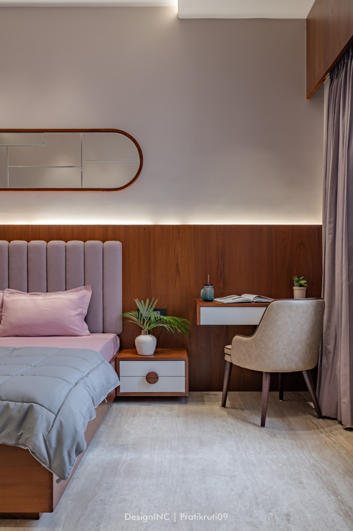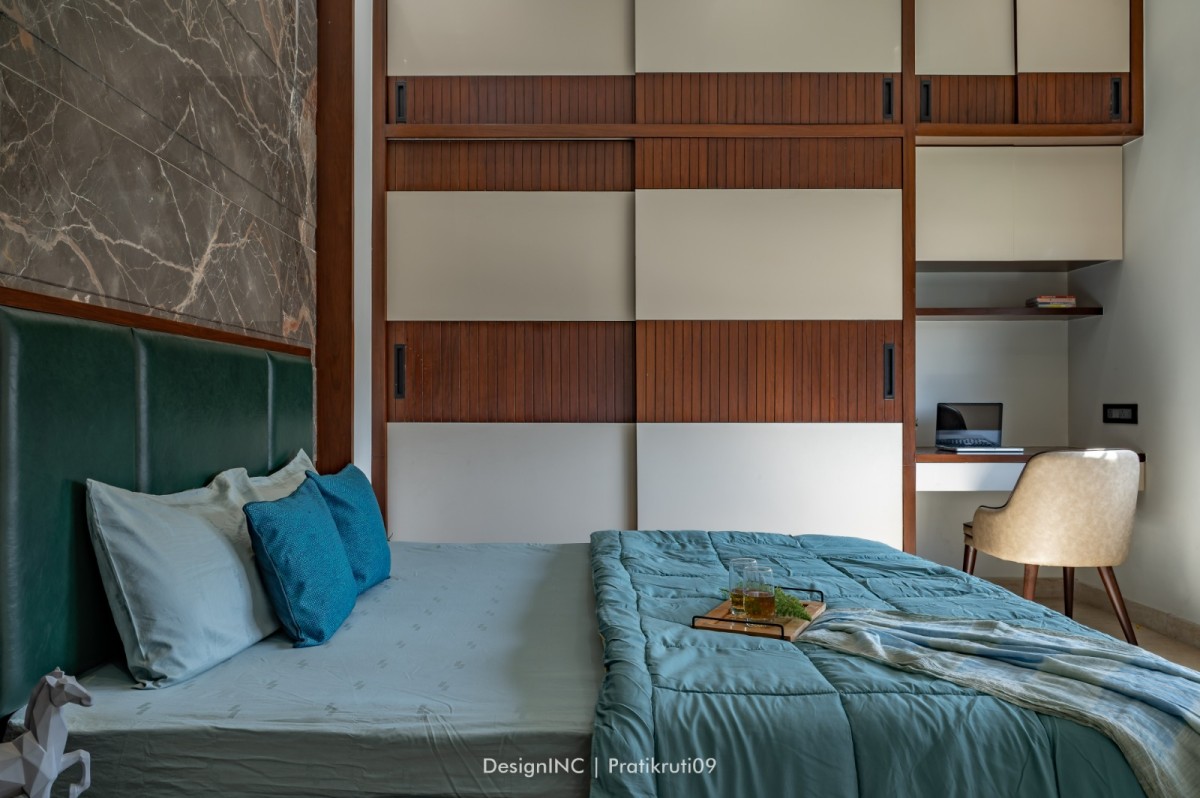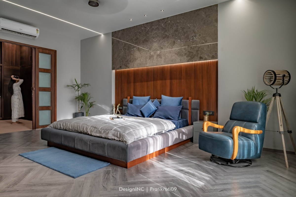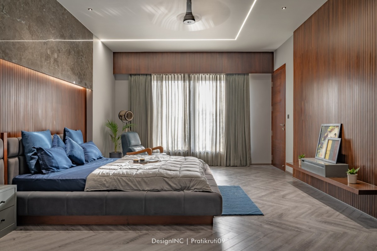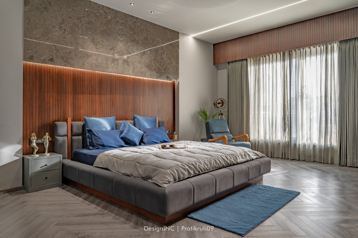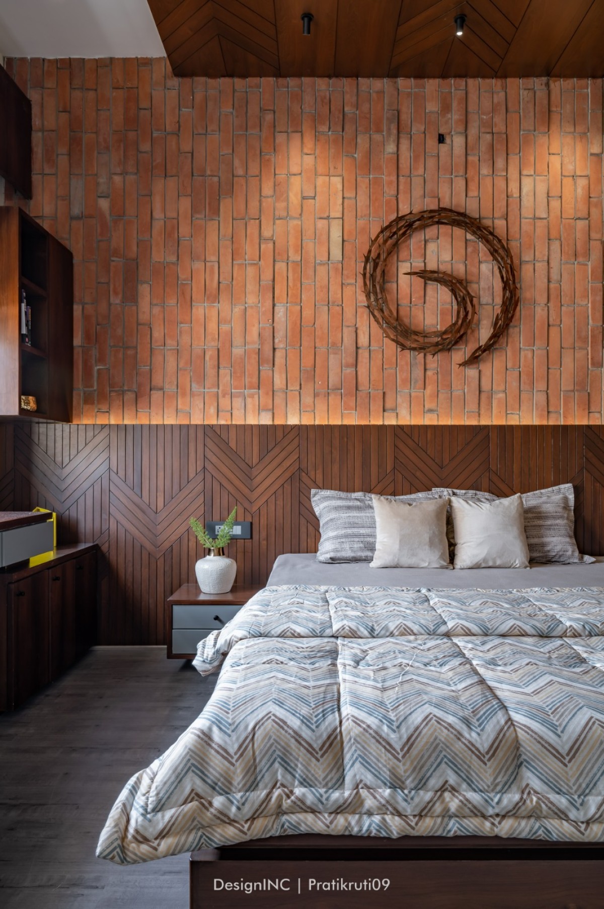 Mirrors have been utilized strategically to enhance natural light and create an illusion of larger spaces. Placement of mirrors opposite windows and in darker areas to reflect light has made the interiors brighter. Incorporation of large windows throughout the bungalow to maximize natural light and provide a connection to the outdoors is practised across all liveable spaces. The reflection of natural light on brick surfaces in bedroom has added warmth and character. Textural variations in the brickwork have improvised visual interest in bedroom. Contrast worked on by incorporating sleek and reflective surfaces like mirrors alongside the rough and earthy texture of bricks has brought a modern touch to the design. Ample concealed light has been used for proper functioning of home theatre.