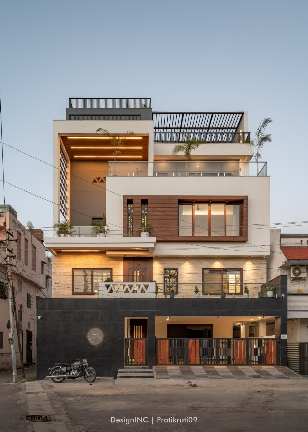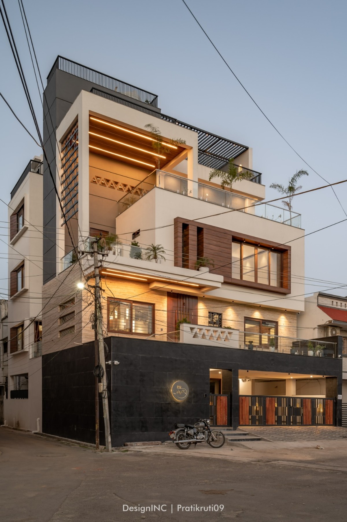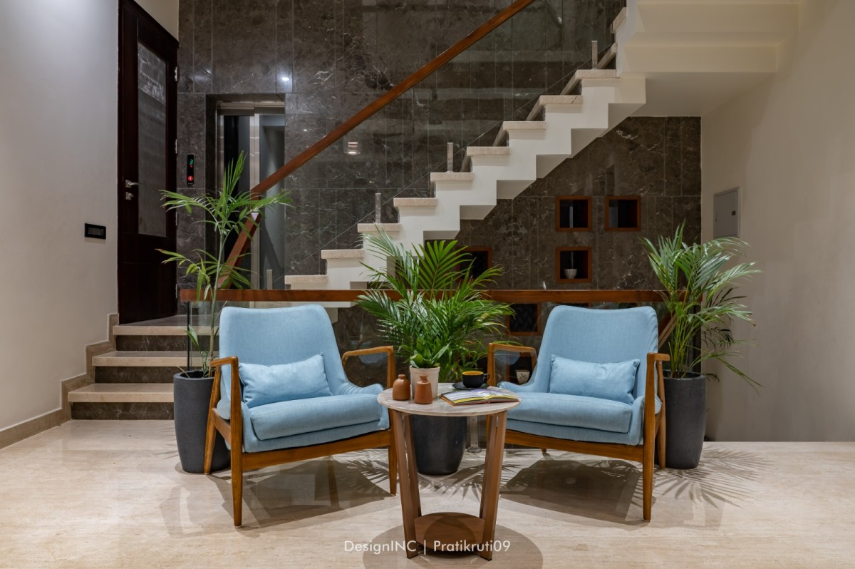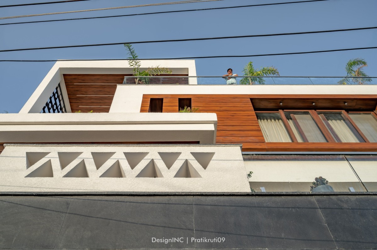 Design idea was quite simple, open and spacious layout ,facilitating needs of varied age groups, with all modern luxuries, and exclusive space for small get together and family functions. Lay out of the bungalow was kept in accordance to segregation of public and private spaces, with common hall, located on ground, thereby, facilitating easy approach for visitors and family to enjoy the space. First floor houses kitchen, living, dining and 2 bedrooms, one for parents and other for guests. Second floor accommodates 3 bedrooms, followed by third floor, with a bedroom and home theatre. Levelled terrace providing good interactive gradations and vertical movement lobby, facilitating all floor plates happen to be key point of spatial planning. Terrace has a semi open/open Jacuzzi with adequate interactive landscape.