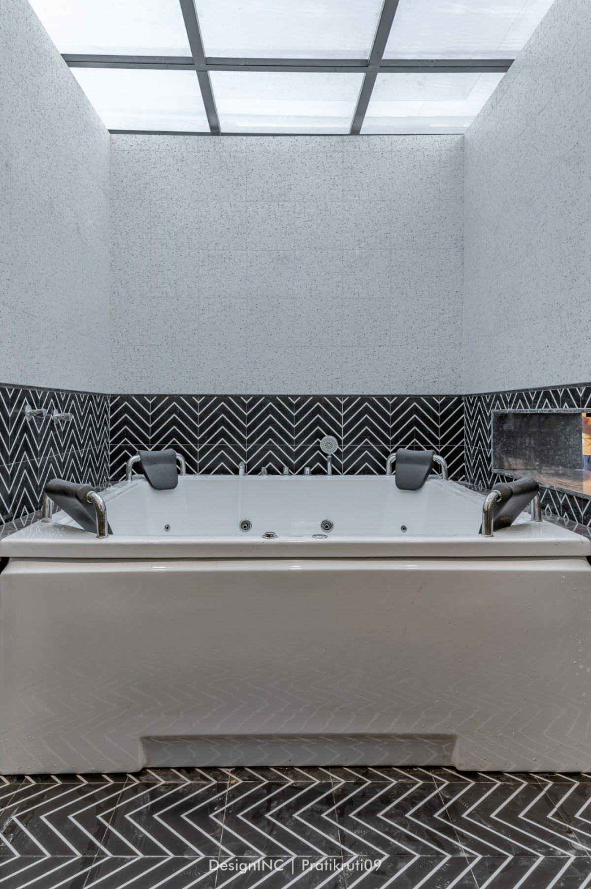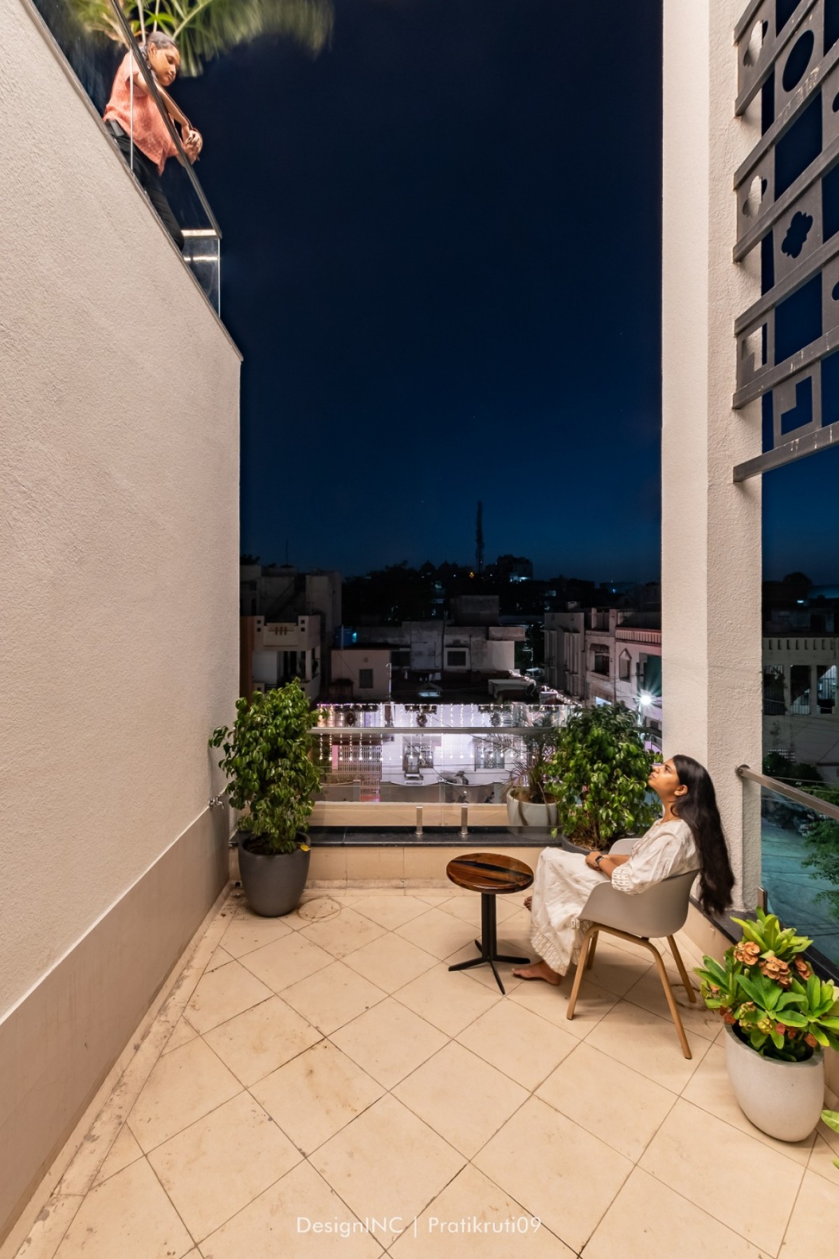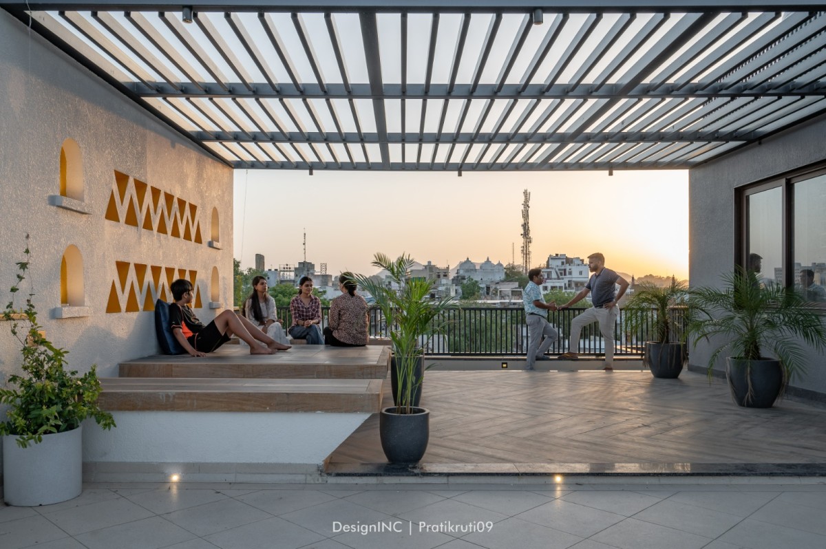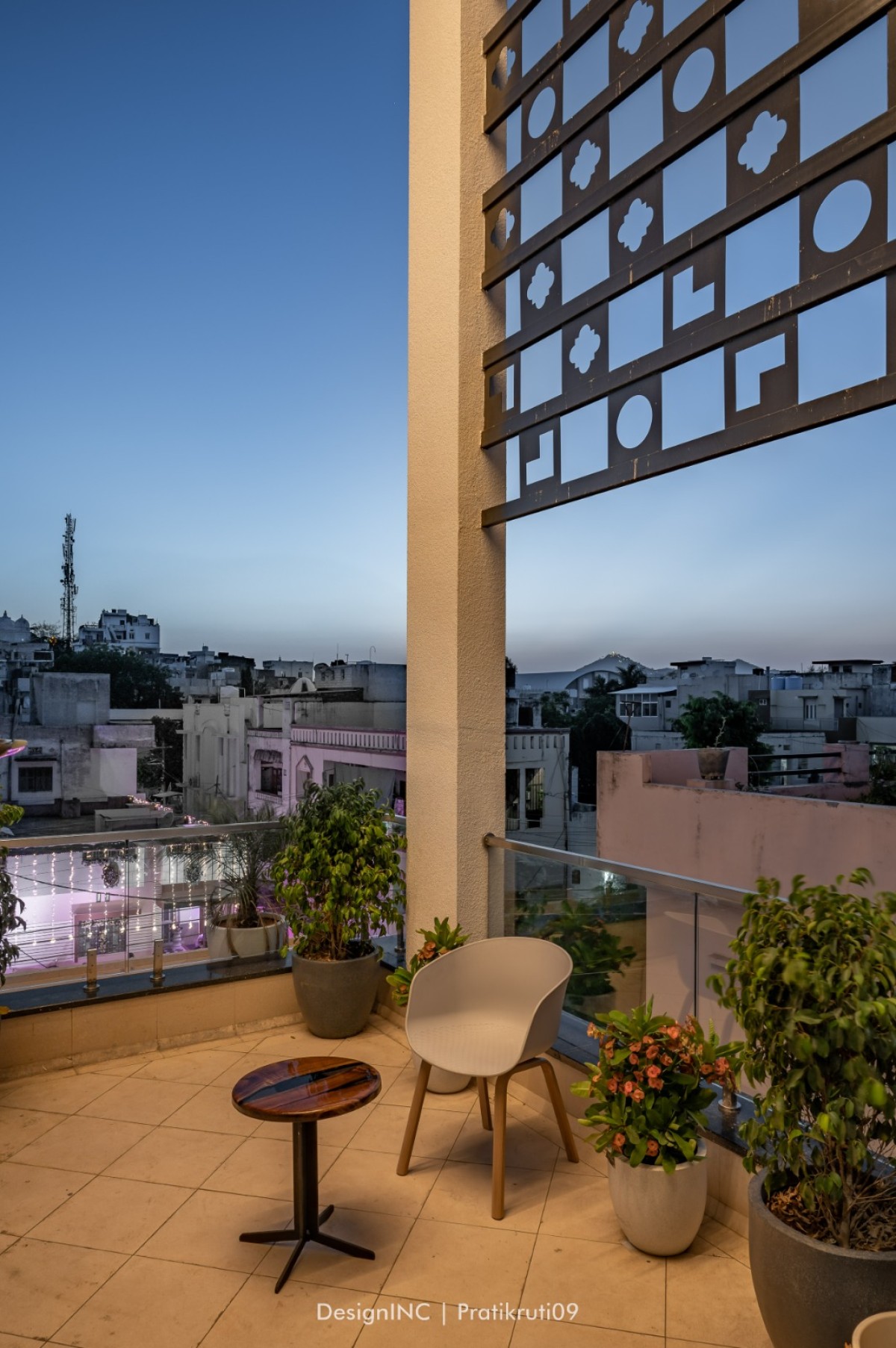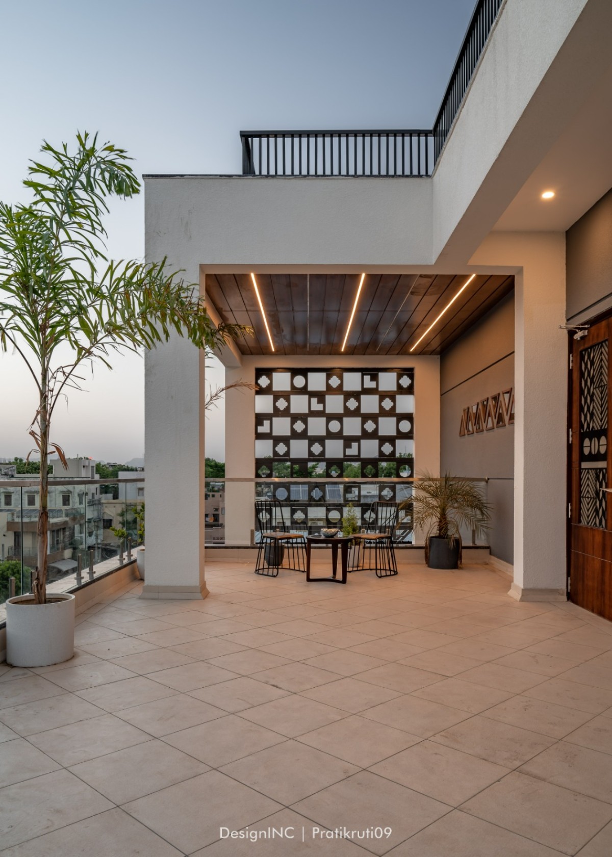 Landscaping formulates an integral component in the design of bungalow, with use of CNC on railing and interiors as well. Terraces located on all levels are landscape elements, with low maintenance elements. Black and white Jacuzzi is made of tiles and terrazzo combination, making the space quite dramatic. To sum up, Integration entails seamlessly connecting indoor and outdoor spaces, blurring the boundaries between them. This creates a sense of continuity and expands the living area. Fluidity emphasizes open floor plans, maximizing natural light and views while facilitating a smooth flow between rooms and the terrace. Nature-inspired aesthetics bring the outdoors inside, incorporating natural materials, greenery, to create a soothing and refreshing ambiance. The terrace becomes an extension of the living space, providing a versatile outdoor area for relaxation, entertainment, and connection with nature.