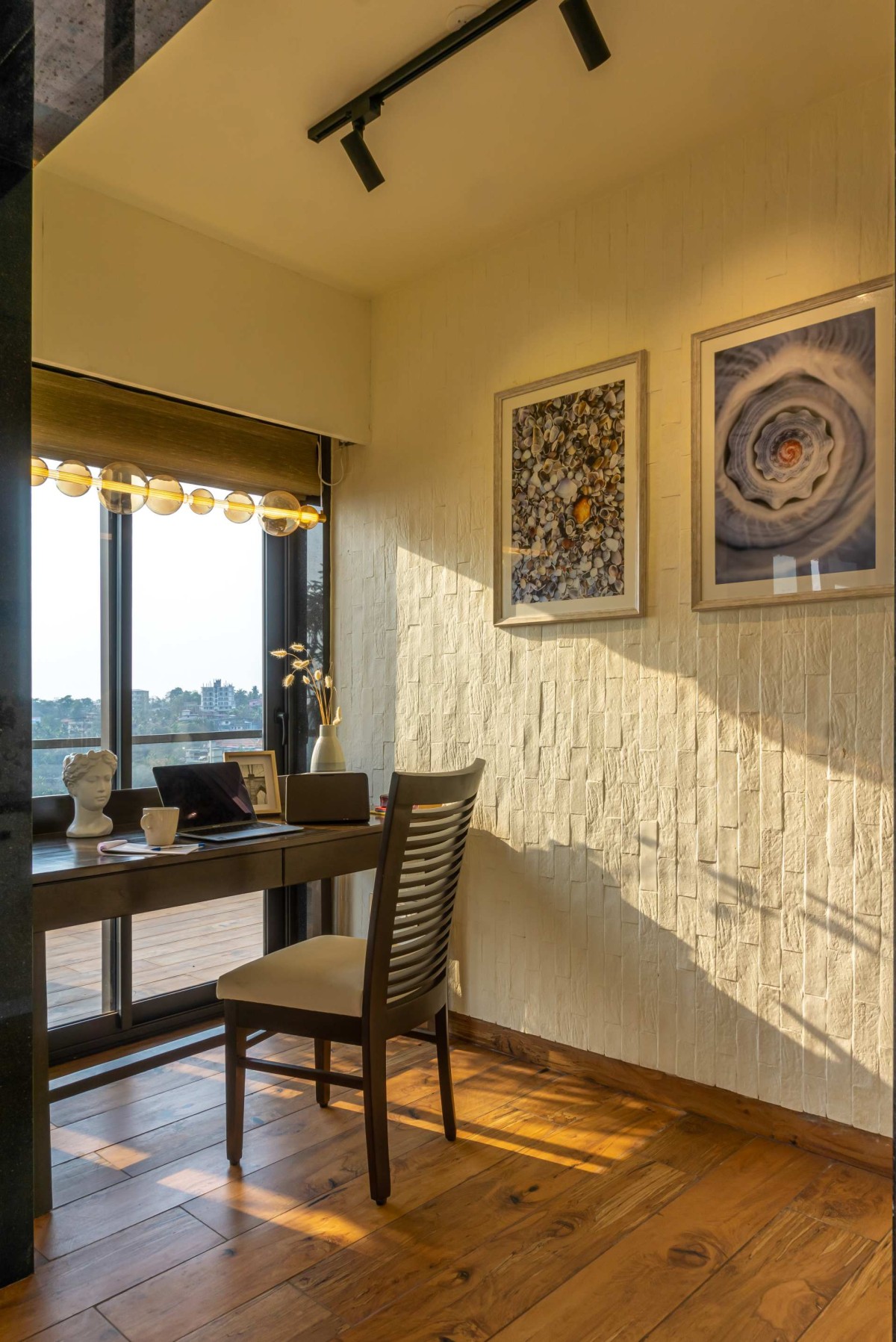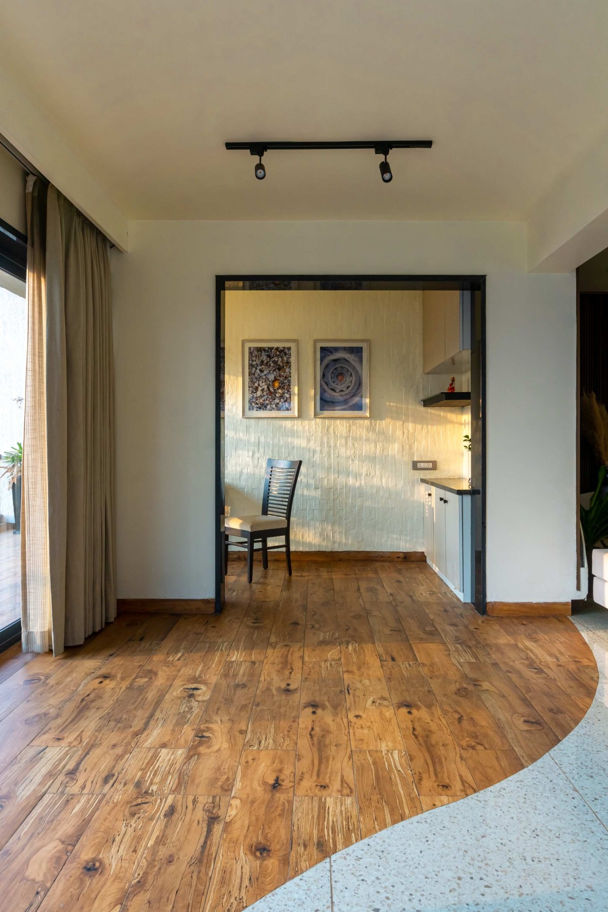 While the apartment may feel raw and effortless, it’s quietly technologically advanced beneath the surface. Fully automated, from lighting systems to the guillotine windows, the home responds intuitively to climate, comfort, and mood. The guillotine windows, a rarity in Indian homes, were introduced to offer uninterrupted views and cross ventilation, especially essential during Goa’s monsoon-heavy seasons. They open vertically at the touch of a button, blurring the boundary between inside and outside while shielding the interiors from rain.