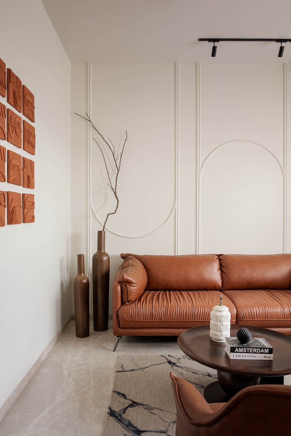 The formal living room continues the home’s measured aesthetic. Tan leather seating is paired with a sculptural coffee table, introducing varied geometry into the space. This interplay of curves and angular forms adds visual interest while maintaining balance. Terracotta frames along one wall echo the warm tones of the furniture and reinforce the earthy palette.
