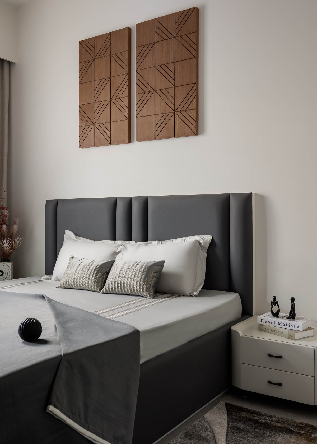 The private rooms reflect individual personalities. The master suite emphasizes calm with clean lines, softened by gentle curves and anchored by a teal four-poster bed. A reading nook by the window, accented with bohemian artwork, provides a peaceful retreat. The son’s room features a bold 3D tree mural within a circular inset and a concealed door leading to a walk-in wardrobe with chevron-patterned rattan and fluted glass shutters. A study nook with floating shelves and a rocking chair adds functionality. The daughter’s room adopts softer tones with stucco-textured paint, floral sconces, and delicate décor, while the guest bedroom introduces cooler greys balanced by wooden artworks.