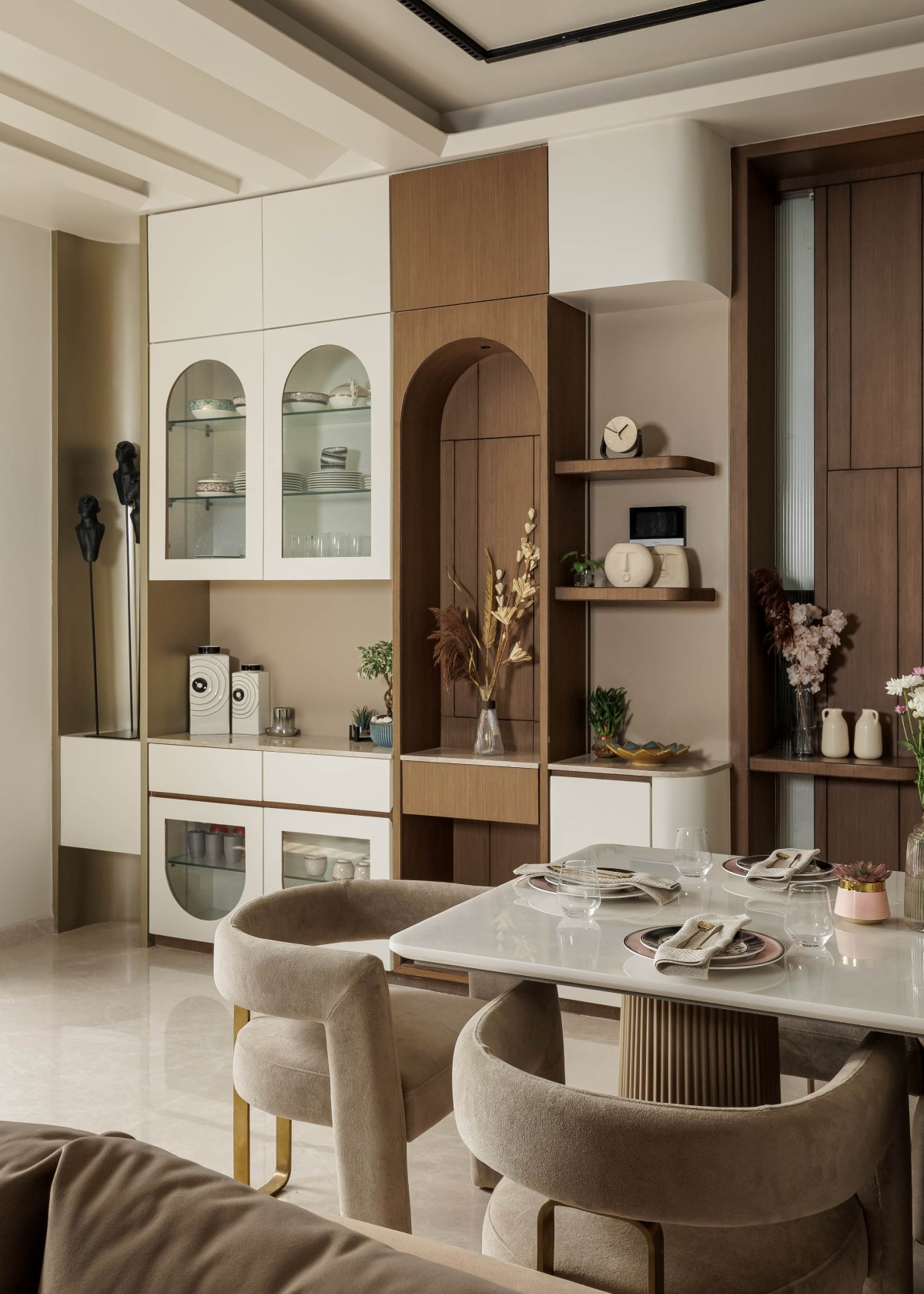 Moving deeper into the house, the communal areas unfold in a soft spectrum of beige, connected by a recurring motif of arches. A sliding partition allows the spaces to be separated when necessary while maintaining a sense of openness. The dining area features a six-seater table with ribbed, tapering legs and an onyx marble top, complemented by brass-finished chairs. Nearby, a cleverly designed crockery unit conceals the electrical board behind veneer panels, blending functionality with design.