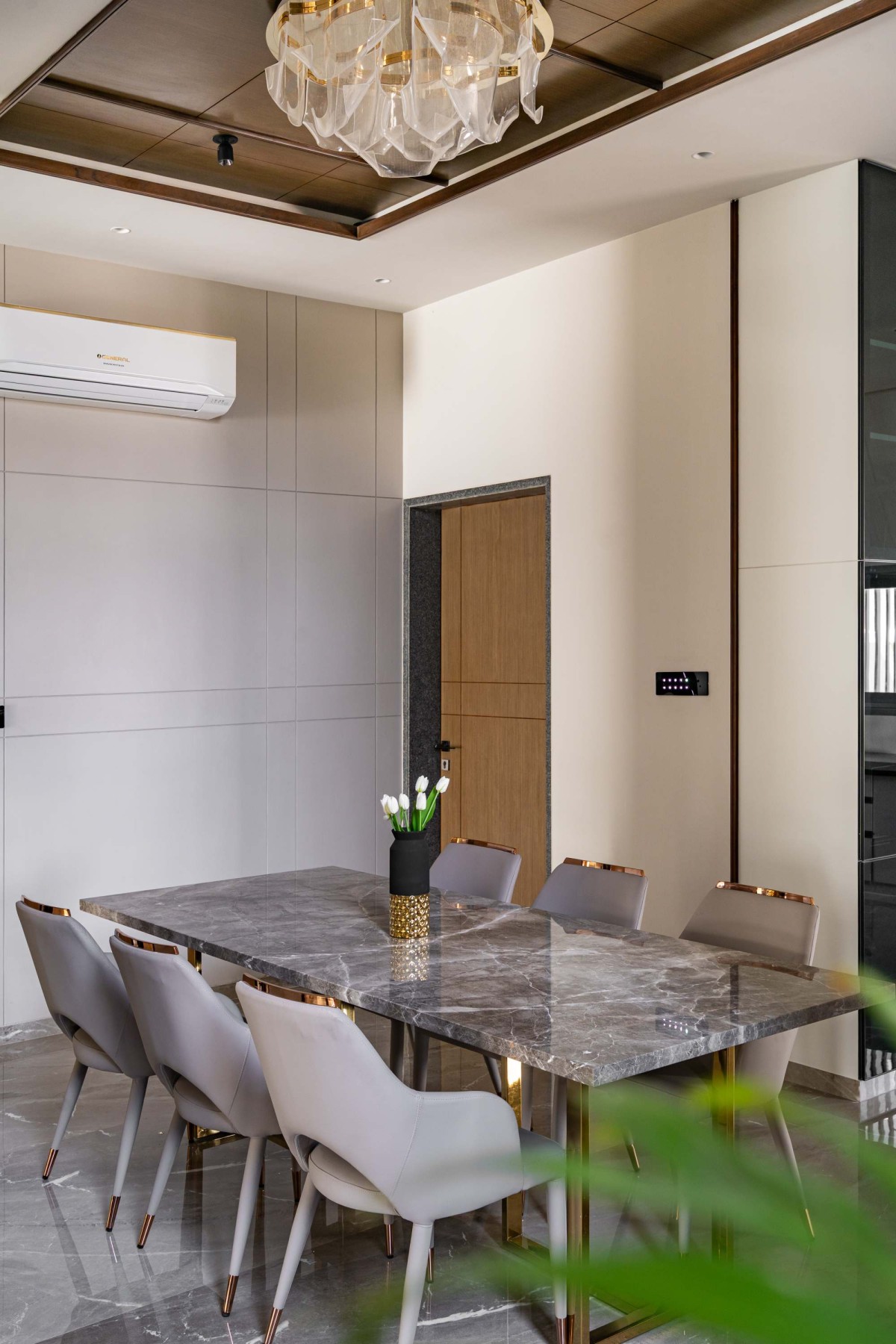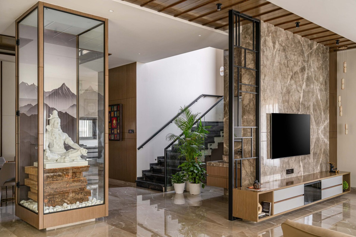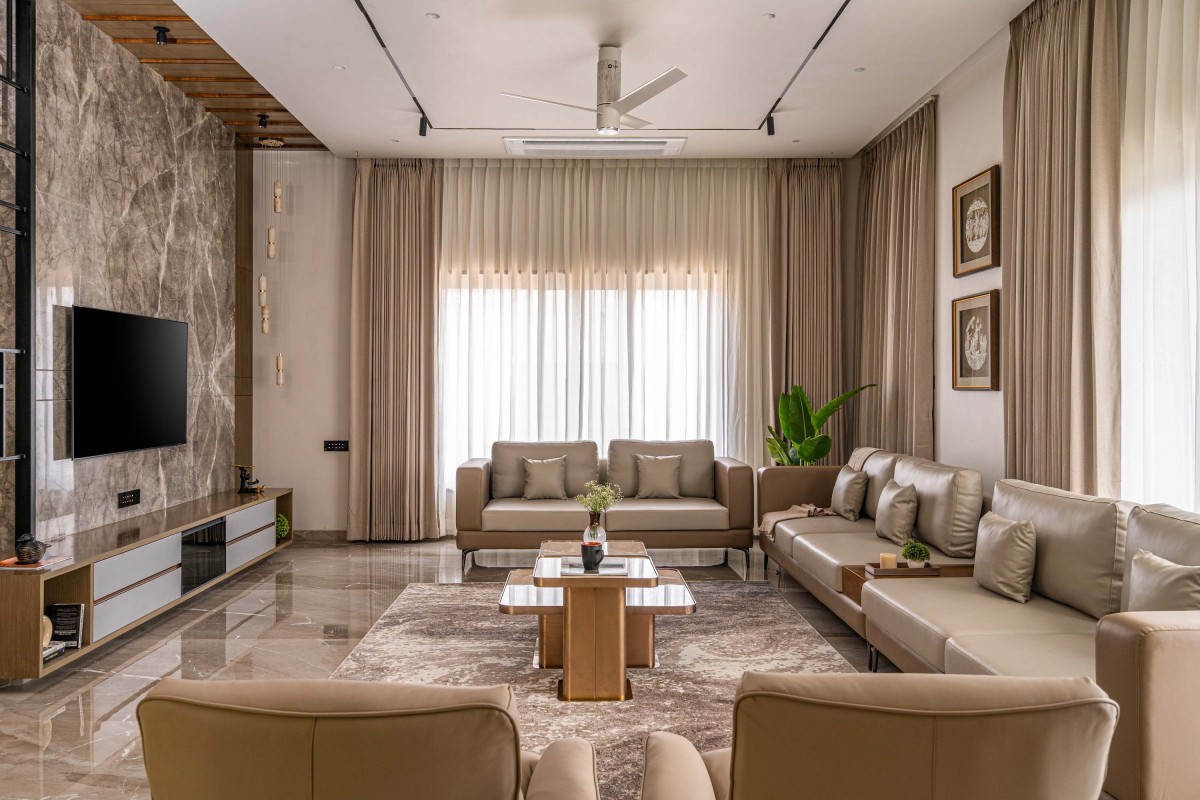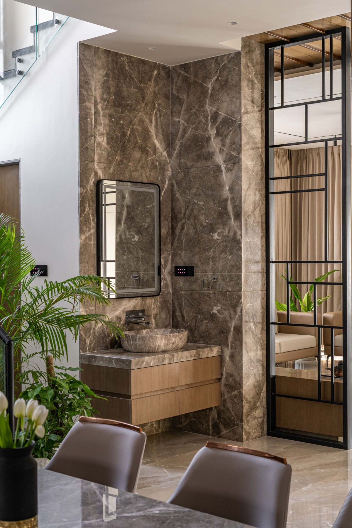 Throughout the bungalow, the materials play a central role in giving the home its distinctive narrative. Stone textures echo strength, polished marble offers elegance, muted textiles provide comfort, and carefully selected wood and metal details bring warmth and refinement. Each element—whether structural, spatial, or decorative—contributes to a cohesive and highly livable environment, where architecture, interior design, and nature are harmoniously aligned.