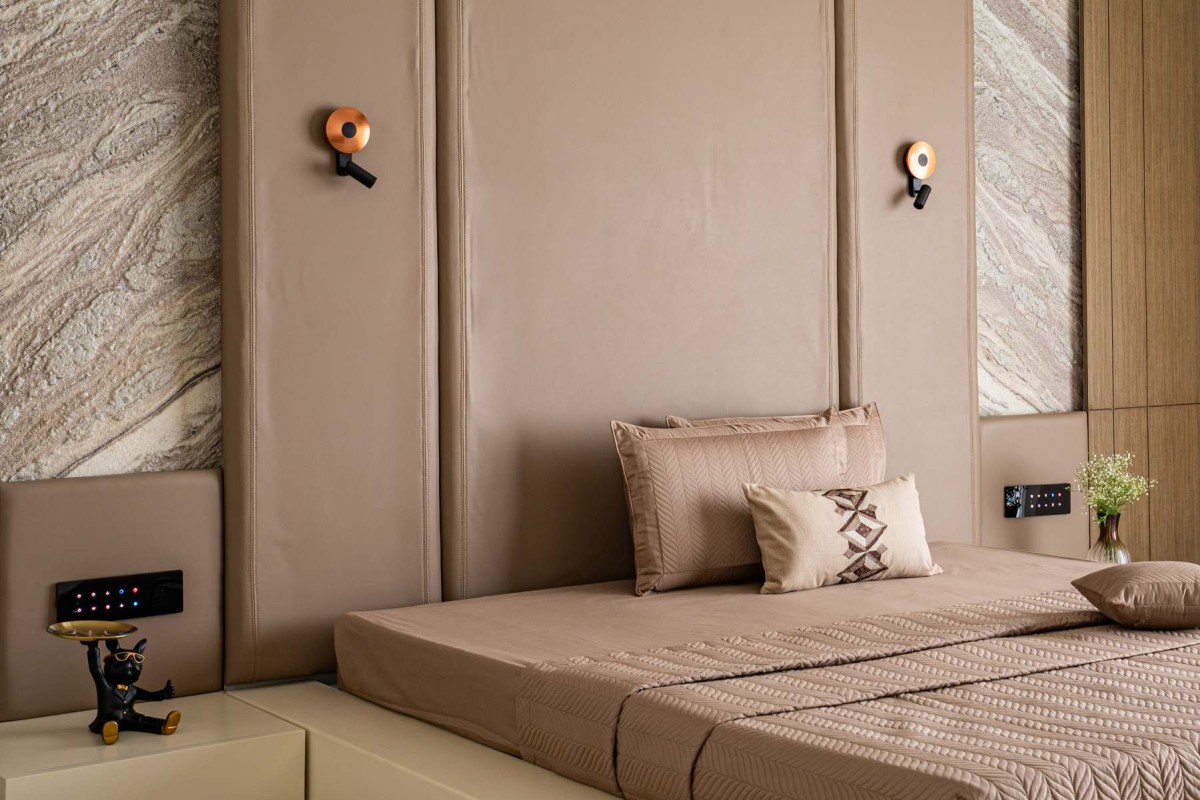 The bedrooms within the bungalow reflect individualized yet cohesive design philosophies, each rooted in contemporary sophistication while responding to different moods and lifestyles. The master suite is anchored by a striking custom leather headboard that extends gracefully to the ceiling, framed with textured stone cladding for tactile contrast. Wrapped in warm taupe and beige tones, the room fosters serenity through minimalist furniture, floating nightstands, and subtle ambient lighting. Accents in warm metals and bespoke accessories lend just the right amount of eclectic charm, while integrated seating and shelving illustrate the careful merging of form and function.